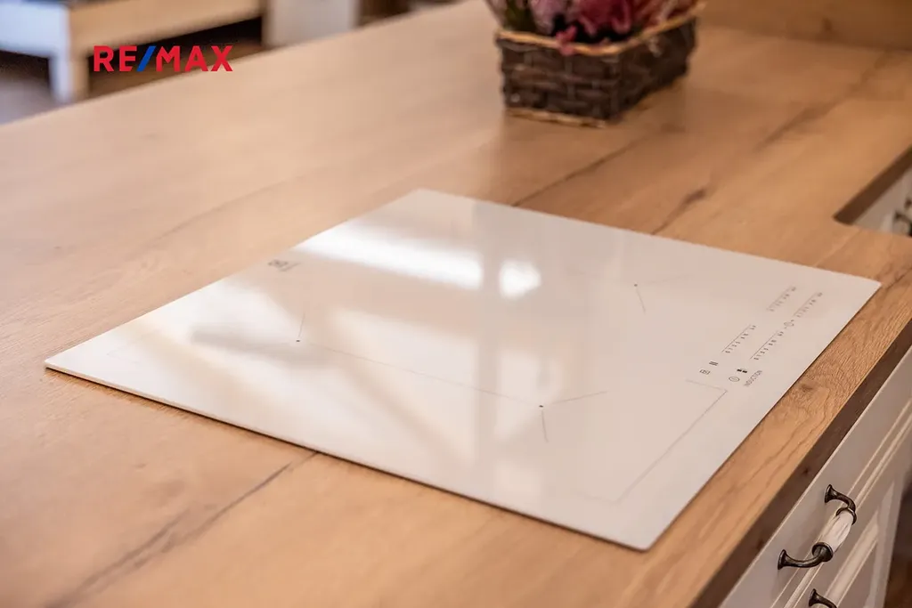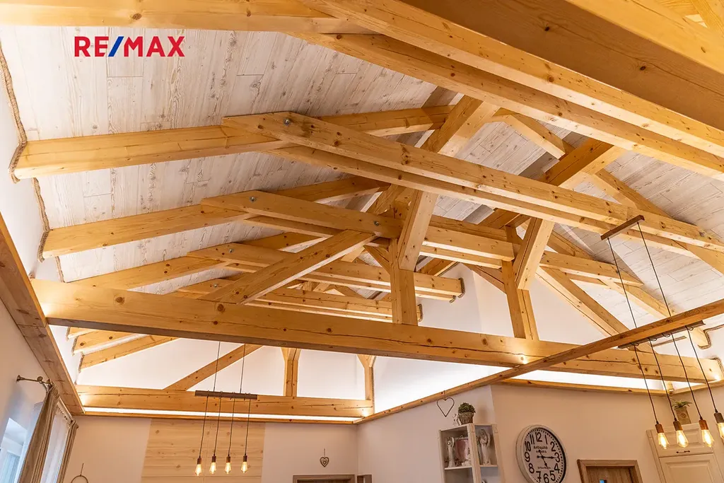 Dominantou domu je prostorná kuchyně propojená s obývacím pokojem, kde vás na první pohled zaujme otevřený strop s přiznanými krovy a decentním podsvícením, které vytváří útulnou atmosféru. V kuchyni byl použit masiv, což zajišťuje nejen vysokou kvalitu, ale i nadčasový vzhled. Celý dům je orientován na jih, což zaručuje dostatek přirozeného světla po celý den. V každém pokoji jsou francouzské dveře a je tak možné projít na zahradu přímo z pokoje, či ložnice.