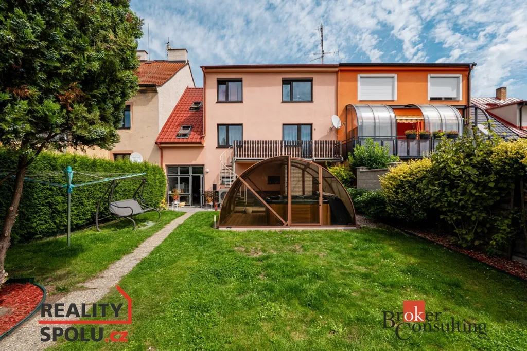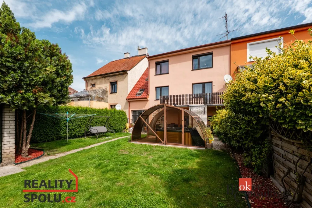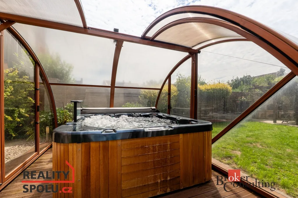 Na zahradu je přístup průjezdem nebo po schodišti z balkonu. Najdete zde zastřešenou vířivku, pergolu s krbem pro příjemné posezení v létě a dřevěný domek na zahradní náčiní.