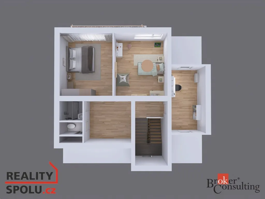 Zde se nachází ložnice, dva samostatné pokoje, samostatná toaleta a koupelna se sprchovým koutem.