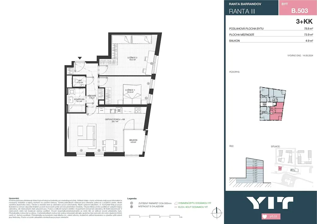 Byt 3+kk o celkové rozloze 78,8 m² s balkónem 4,9 m² je situován v 5.NP projektu RANTA Barrandov III. Cena zahrnuje bytovou jednotku, sklepní kóji a DPH. K bytu náleží i parkovací stání, které není zahrnuto v ceně. Cena parkovacího stání od 665 500 Kč včetně DPH.