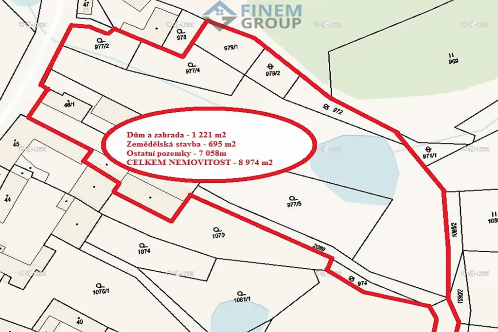Celková výměra zastavěných ploch je 963 m2, dvůr má 695 m2. Ze dvora, kde se po pravé straně nacházejí další přilehlé stavby, je přímý vstup na pozemky rozlehlé zahrady o celkové výměře cca 8 974 m², která nabízí široké možnosti využití – od rekreačního zázemí přes zahradničení až po hospodářské účely. Na zahradě je vlastní studna s dostatečnou kapacitou vody.