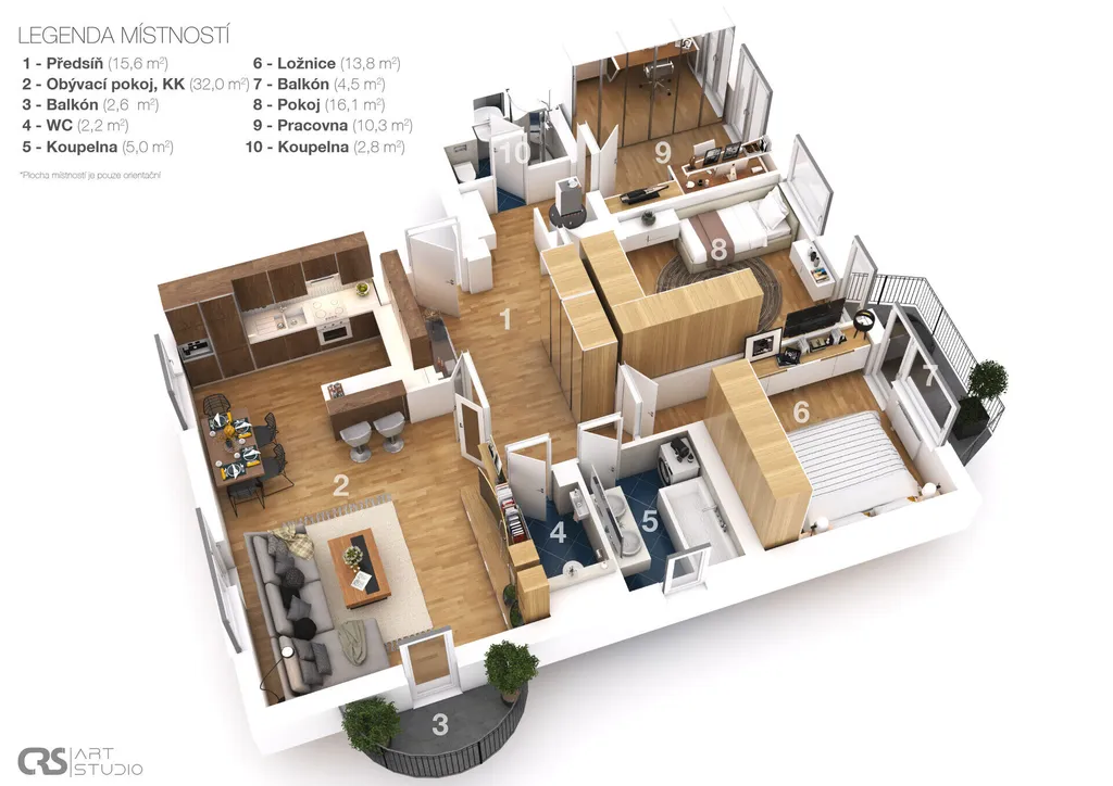 Obrovským benefitem jsou dva krásné slunné balkony – ideální na ranní kávu i večerní odpočinek. Jeden navazuje na obývací pokoj (2,6 m²), druhý, větší (4,5 m²), je přístupný z ložnice.