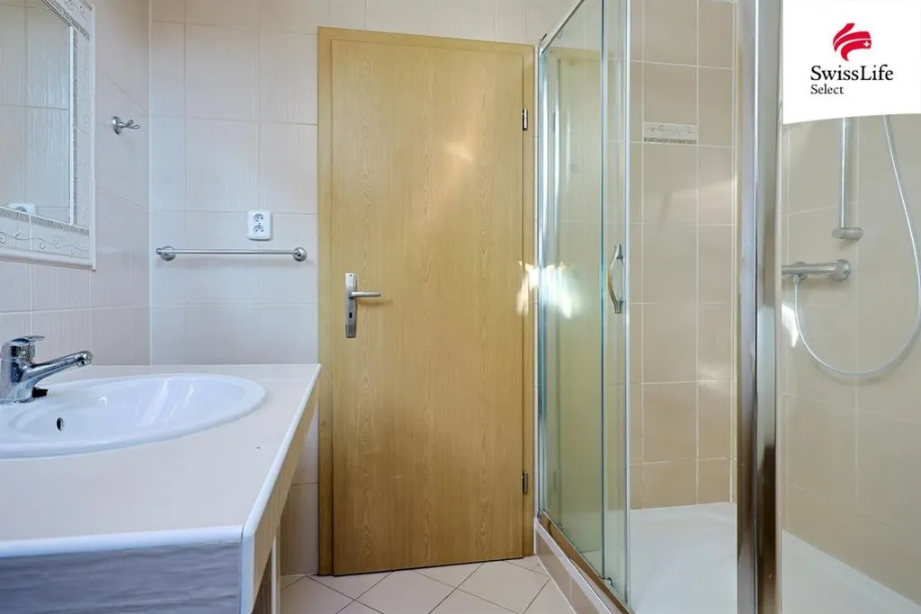 V podkroví jsou tři pokoje - jeden s balkonem, dále prostorná šatna, WC a koupelna se sprchou. Je zde také klimatizace.