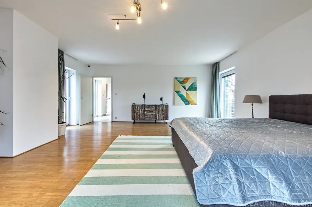 Velkorysý prostor: 4 prostorné ložnice, 3 koupelny a rozlehlý obývací pokoj, který tvoří srdce celého domu.