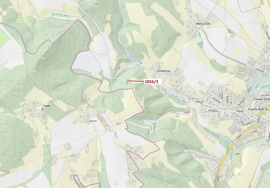 Lesní pozemek o výměře 448 m2, parcelní číslo 2856/3, podíl 1/1, katastrální území Český Dub, obec Český Dub, obec s rozšířenou působností Liberec, okres Liberec, Liberecký kraj. Po těžbě.