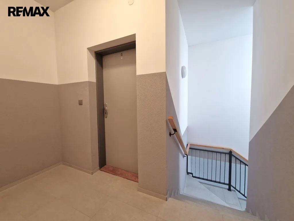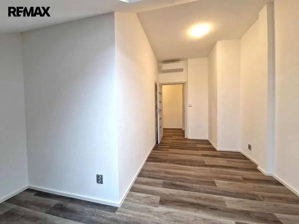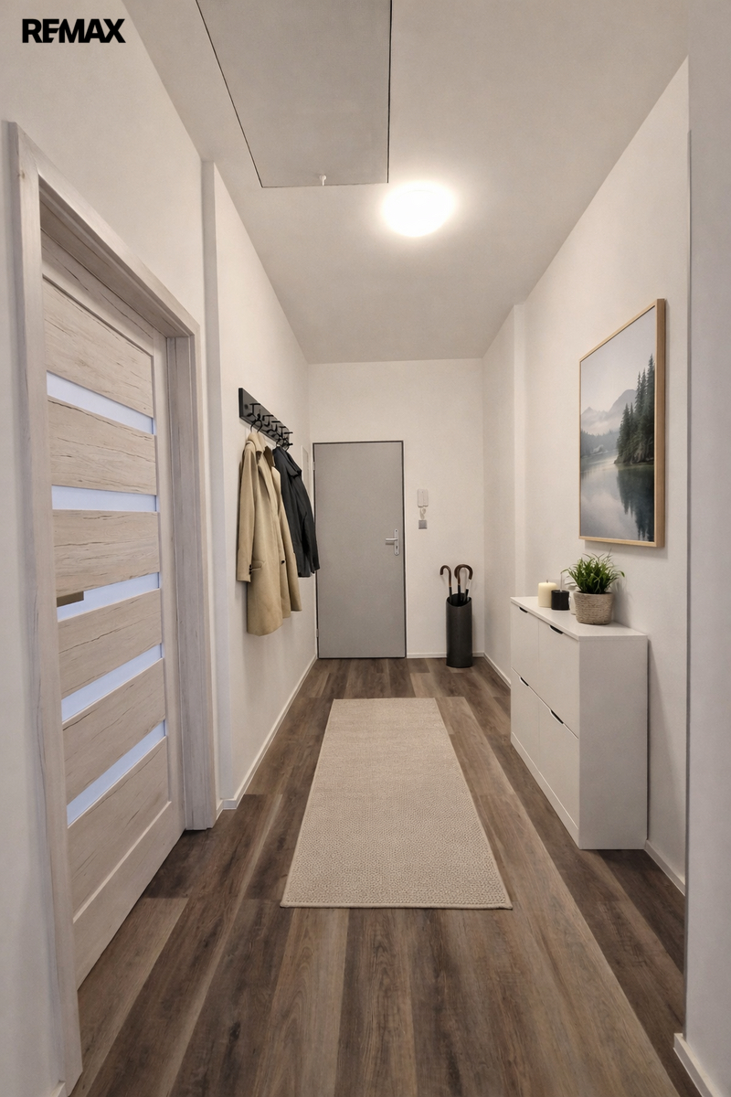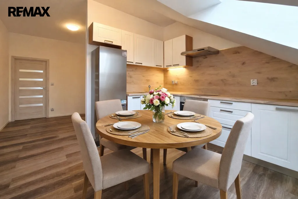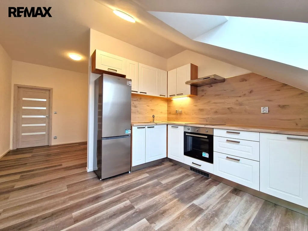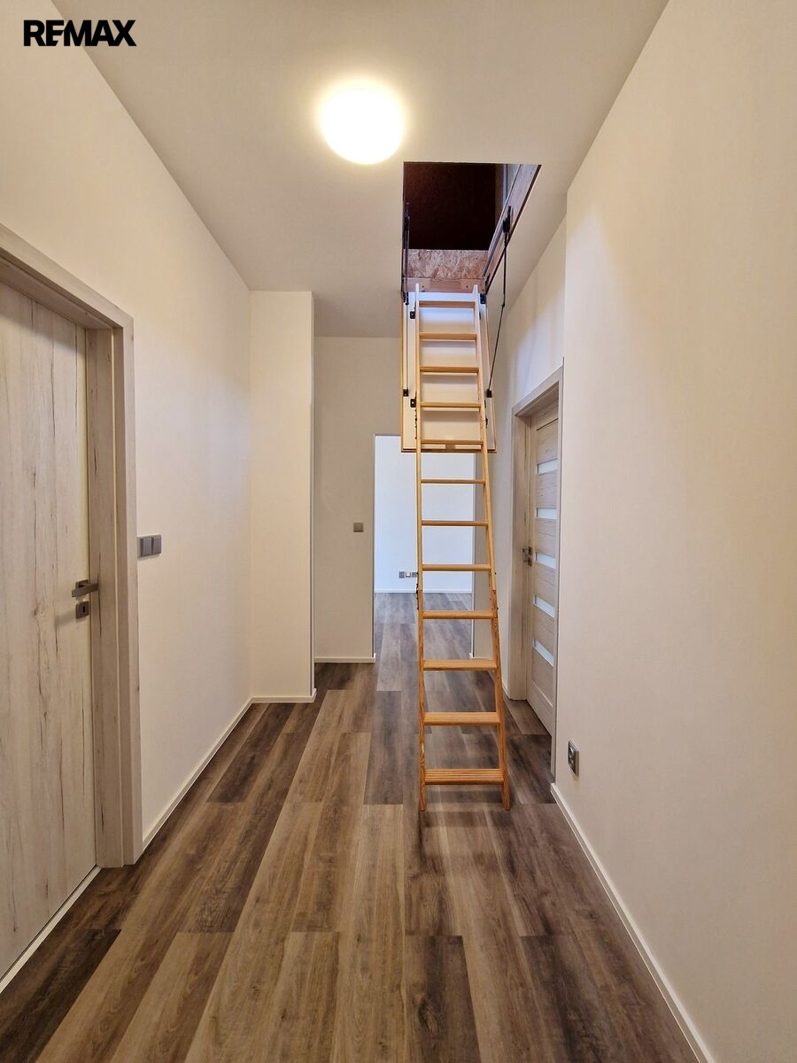 Byt tvoří vstupní předsíň (7,6 m2), ložnice (10,5 m2), obývací pokoj + kk (21,5 m2), pokoj (14,3 m2) a koupelna se sprchovým koutem, umyvadlem a wc (8,1 m2). Moderní komfortní kuchyňská linka je vybavená myčkou, ledničkou s mrazákem a digestoří. Dveře i obložkové zárubně jsou v dekoru dřeva, střešní okna jsou kombinace dřevo/plast. Byt je vytápěn tepelným čerpadlem (vzduch/vzduch) a podlahovým topením. Na předsíni je umístěný elektrický kotel, ohřev vody zajišťuje bojler umístěný v koupelně. Po půdních výsuvných schodech, umístěných v předsíni se dostáváme do půdního prostoru, který představuje další velkorysé možnosti využití. Při rekonstrukci byl kladen velký důraz na protihlukovou izolaci – protihlukový sádrokarton, PUR, kročejová podlahová izolace.