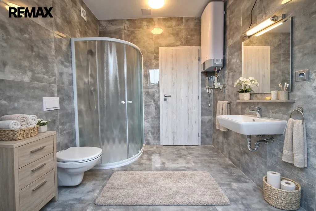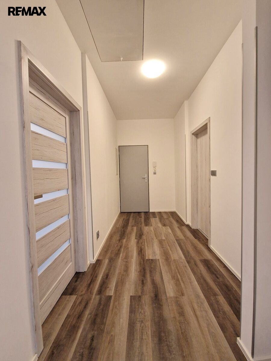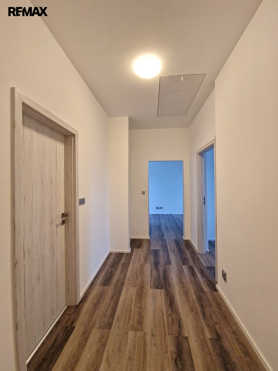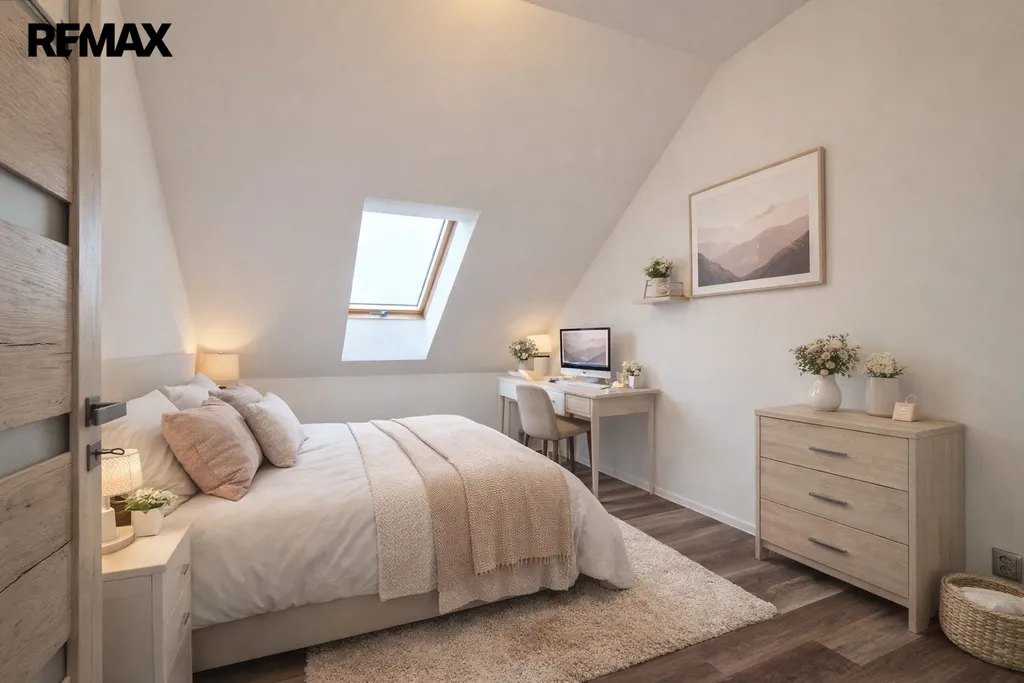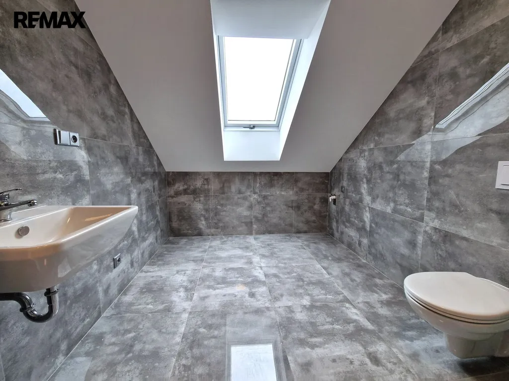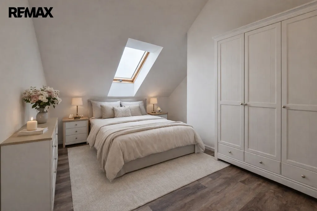 Byt tvoří vstupní předsíň (7,6 m2), ložnice (10,5 m2), obývací pokoj + kk (21,5 m2), pokoj (14,3 m2) a koupelna se sprchovým koutem, umyvadlem a wc (8,1 m2). Moderní komfortní kuchyňská linka je vybavená myčkou, ledničkou s mrazákem a digestoří. Dveře i obložkové zárubně jsou v dekoru dřeva, střešní okna jsou kombinace dřevo/plast. Byt je vytápěn tepelným čerpadlem (vzduch/vzduch) a podlahovým topením. Na předsíni je umístěný elektrický kotel, ohřev vody zajišťuje bojler umístěný v koupelně. Po půdních výsuvných schodech, umístěných v předsíni se dostáváme do půdního prostoru, který představuje další velkorysé možnosti využití. Při rekonstrukci byl kladen velký důraz na protihlukovou izolaci – protihlukový sádrokarton, PUR, kročejová podlahová izolace.