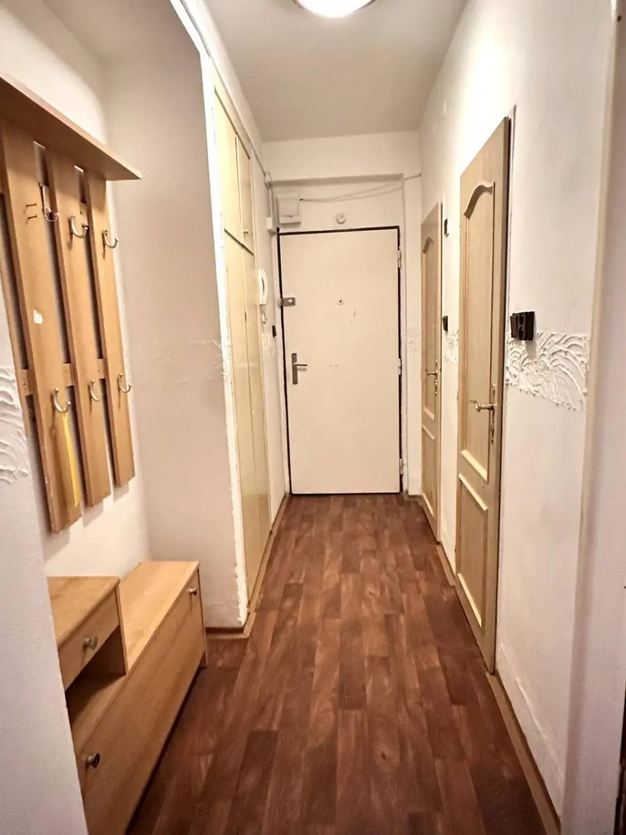 Byt se skládá z prostorného obývacího pokoje se vstupem na balkon, jedné samostatné ložnice, oddělené kuchyně s varnou deskou a nádobím, koupelny s rohovou vanou, samostatné toalety a chodby s dostatkem úložného prostoru. K dispozici je pračka a mikrovlnná trouba.