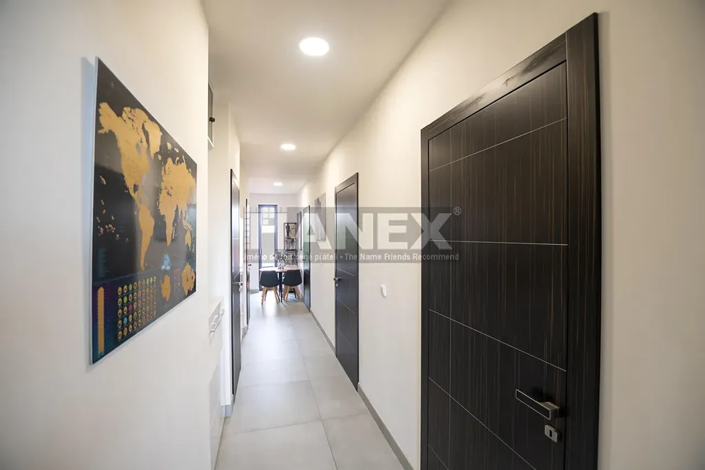 Přehlednou dispozici bytu tvoří obývací pokoj s kuchyňským koutem, třemi ložnicemi a možností vestavby v podkroví. K bytu patří terasa a dvě parkovací stání. Jedno v garáži s přípravou pro dobíjení elektromobilu a druhé venkovní na pozemku.