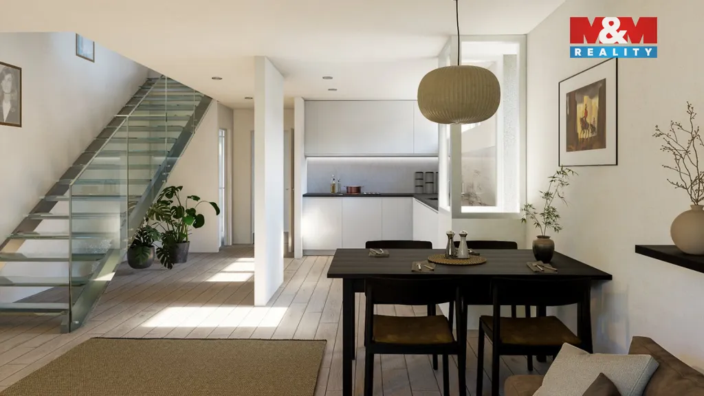 Dům o užitné ploše 130 m² je dispozičně řešen jako 4+kk ve třech podlažích. V přízemí se nachází prostorný obývací pokoj s kuchyňským koutem a jídelnou, vstupní chodba, technická místnost a toaleta. V patře jsou dvě ložnice, koupelna s WC a šatna či pracovna. V posledním podlaží je ložnice s vlastní koupelnou a vstupem na velkou terasu s výhledem do zeleně. K domu náleží zahrada orientovaná do vnitrobloku a parkovací stání na vlastním pozemku. Na pozemek navazuje skalnatý převis, který znemožňuje jakoukoliv další zástavbu sousedící se zahradou.