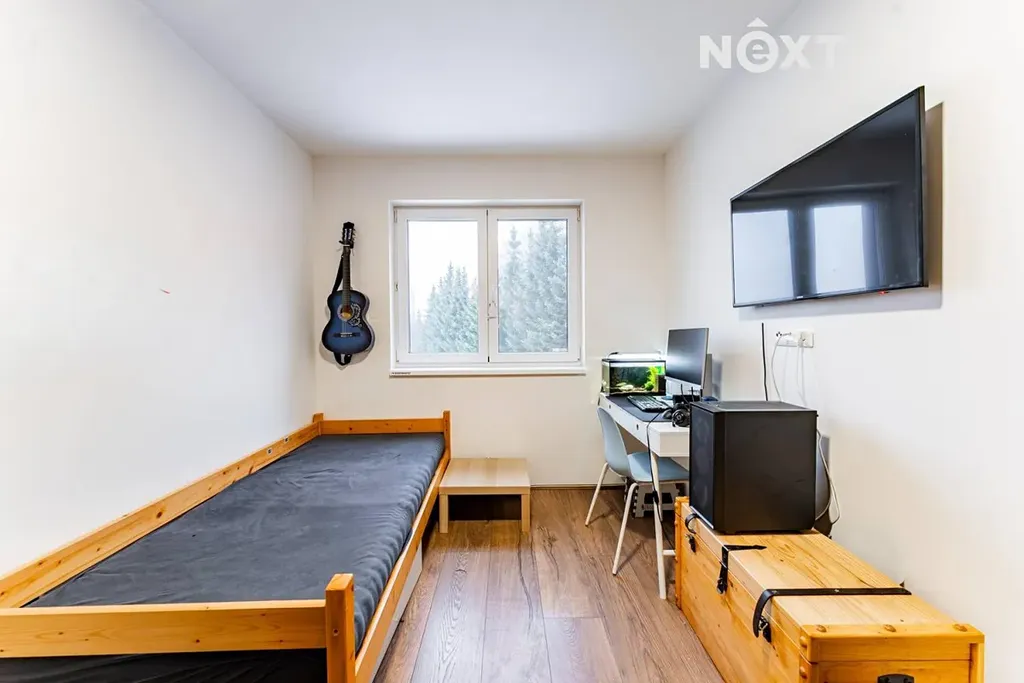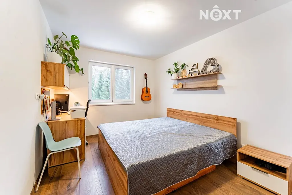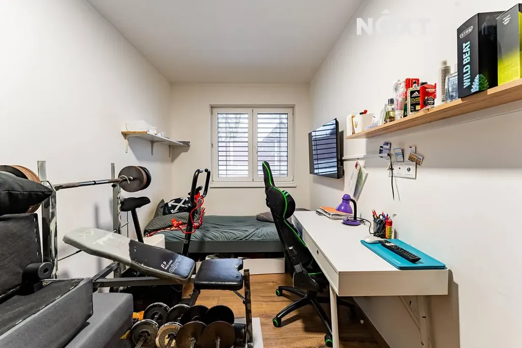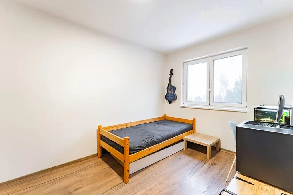 Dále zde naleznete samostatnou toaletu a moderní koupelnu vybavenou vanou i sprchovým koutem. K dispozici jsou také tři samostatné pokoje, které mohou sloužit jako ložnice, dětský pokoj nebo pracovna či studovna. Součástí domu je garáž a spíž, která poskytuje dostatek úložného prostoru.