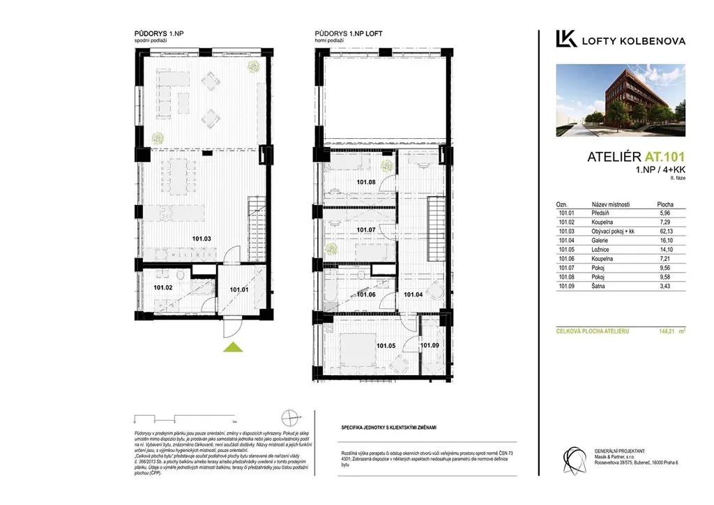 Nabízíme k prodeji luxusní byt ateliérového typu s dispozicí 4+kk o celkové výměře 144,21 m2. Jde o zcela jedinečnou dispozici velkého bytu s velkými okny v každé místnosti a prostorností danou loftovým řešením. Byt je vybaven rekuperací, klimatizační jednotkou, podlahovým topením a předokenními žaluziemi. V tomto loftovém bytě si můžete splnit svůj sen o unikátním bydlení. Vysoké industriální stropy a velká okna s ohromujícím výhledem ve vás vyvolají pocit výjimečnosti.