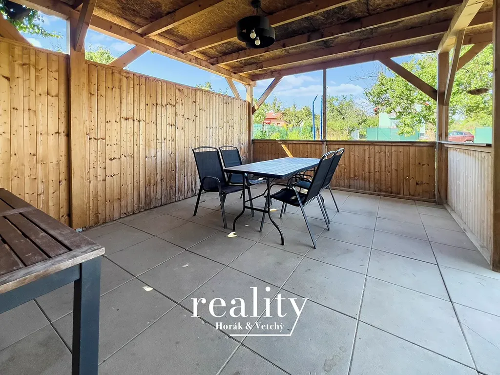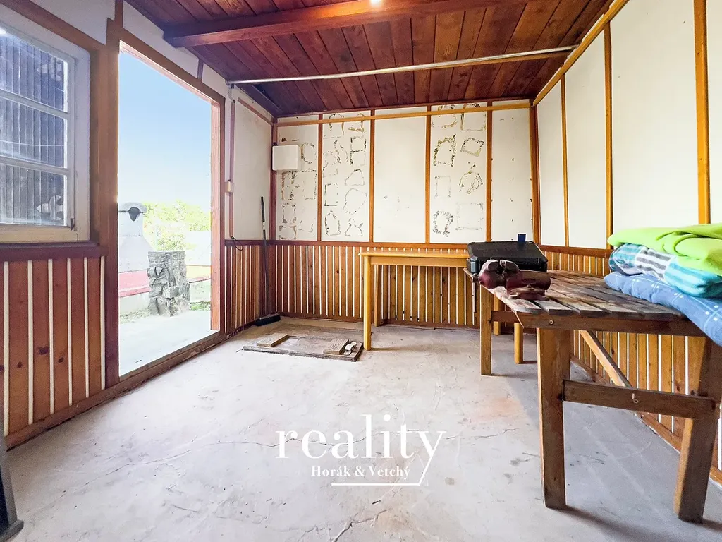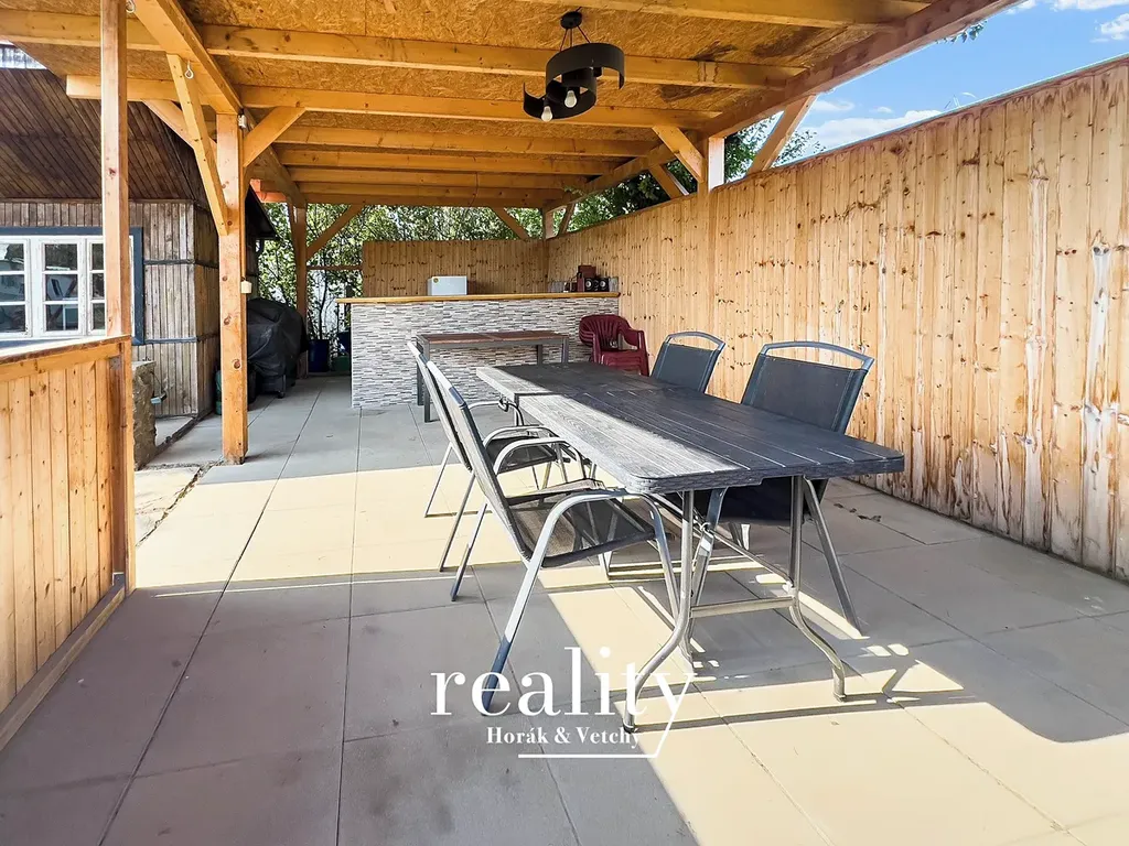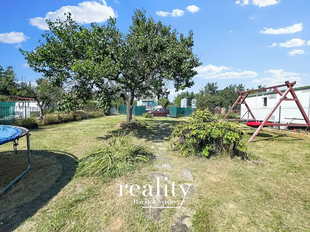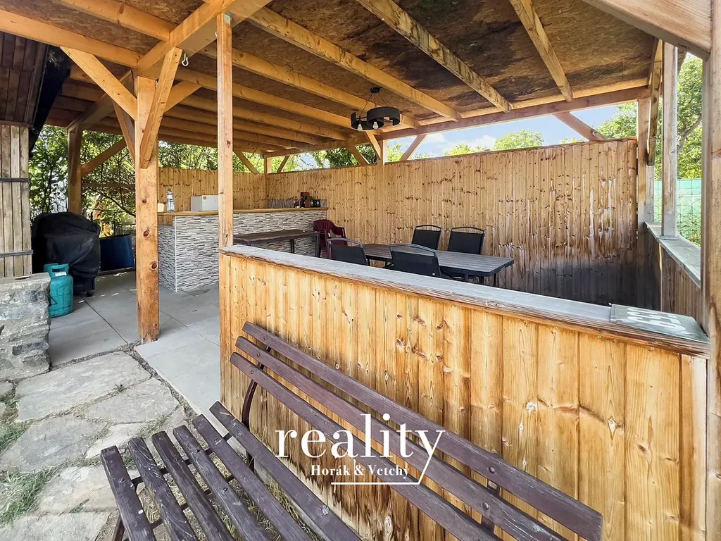 Součástí zahrady je částečně podsklepená dřevěná chatka o zastavěné ploše 15 m², dále zde najdete pergolu s barem a posezením, ohniště s krbem pro letní grilování, dětskou houpačku, trampolínu pro radost nejmenších, suché WC a plechový zahradní domek pro uskladnění nářadí.