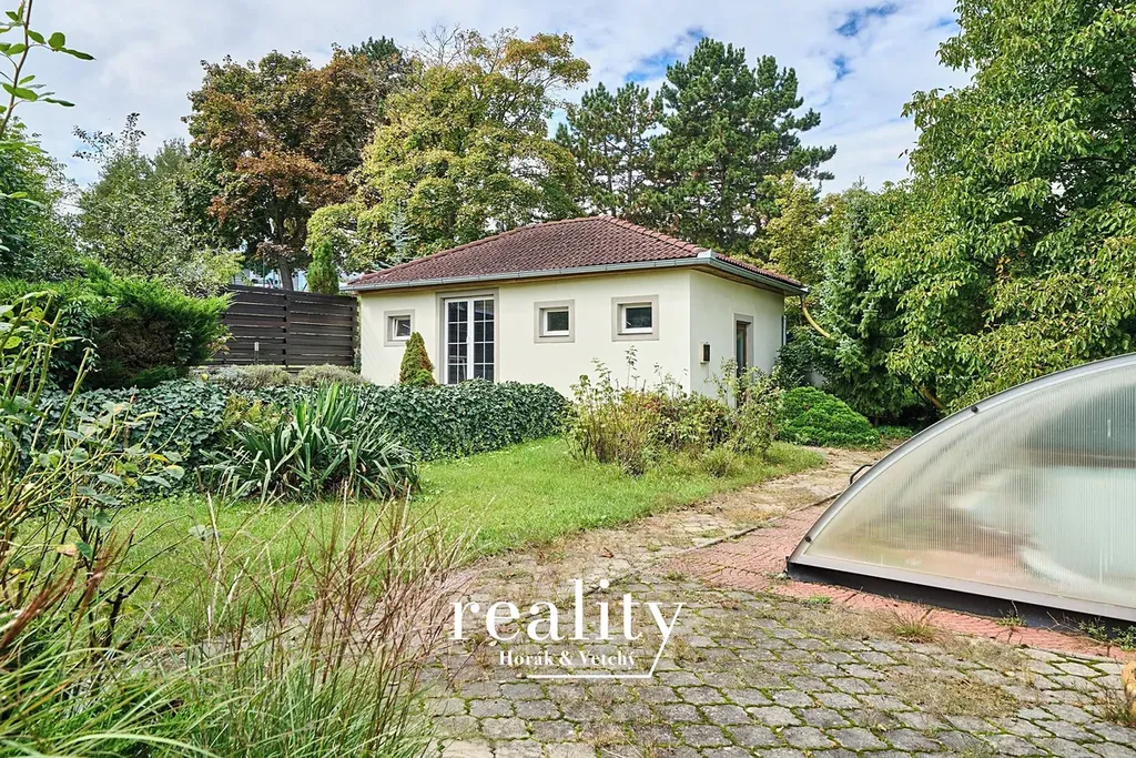Na zahradě se nachází zastřešený bazén (zde je nutná rekonstrukce) a větší zahradní domek, který byl používán jako ateliér, můžete v něm ubytovat hosty nebo si zde vybudovat saunu nebo posilovnu.