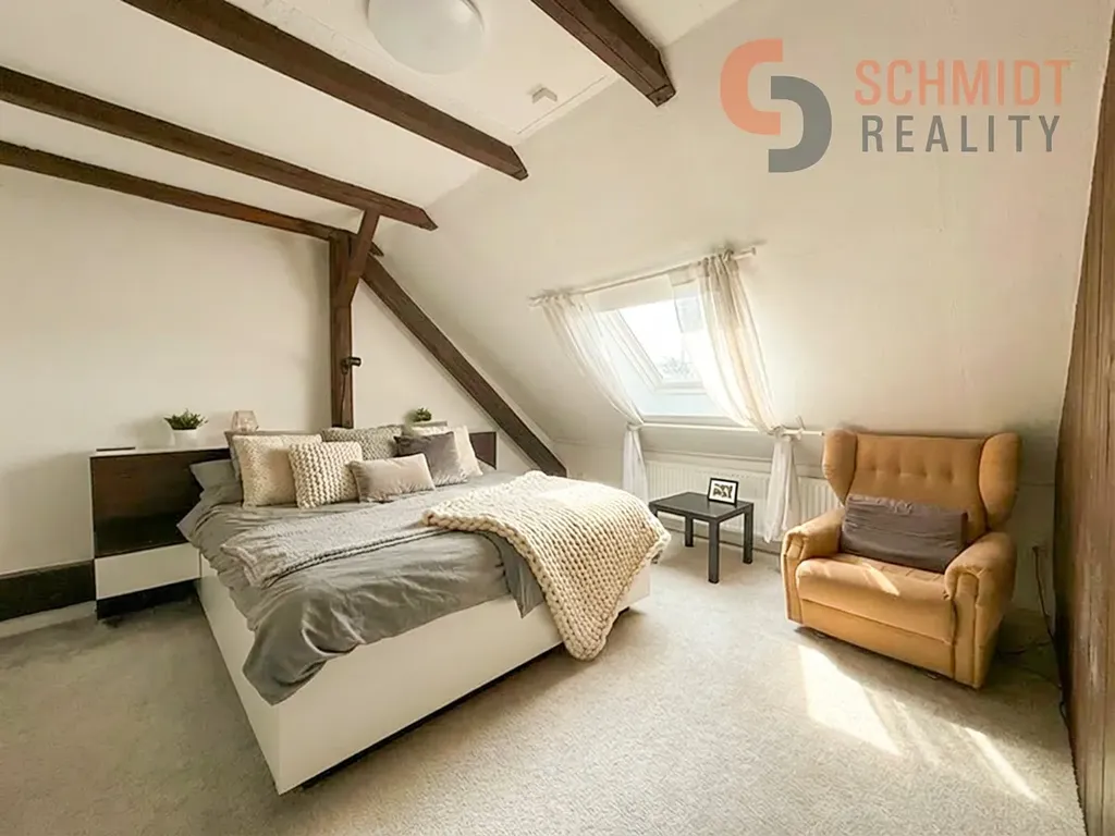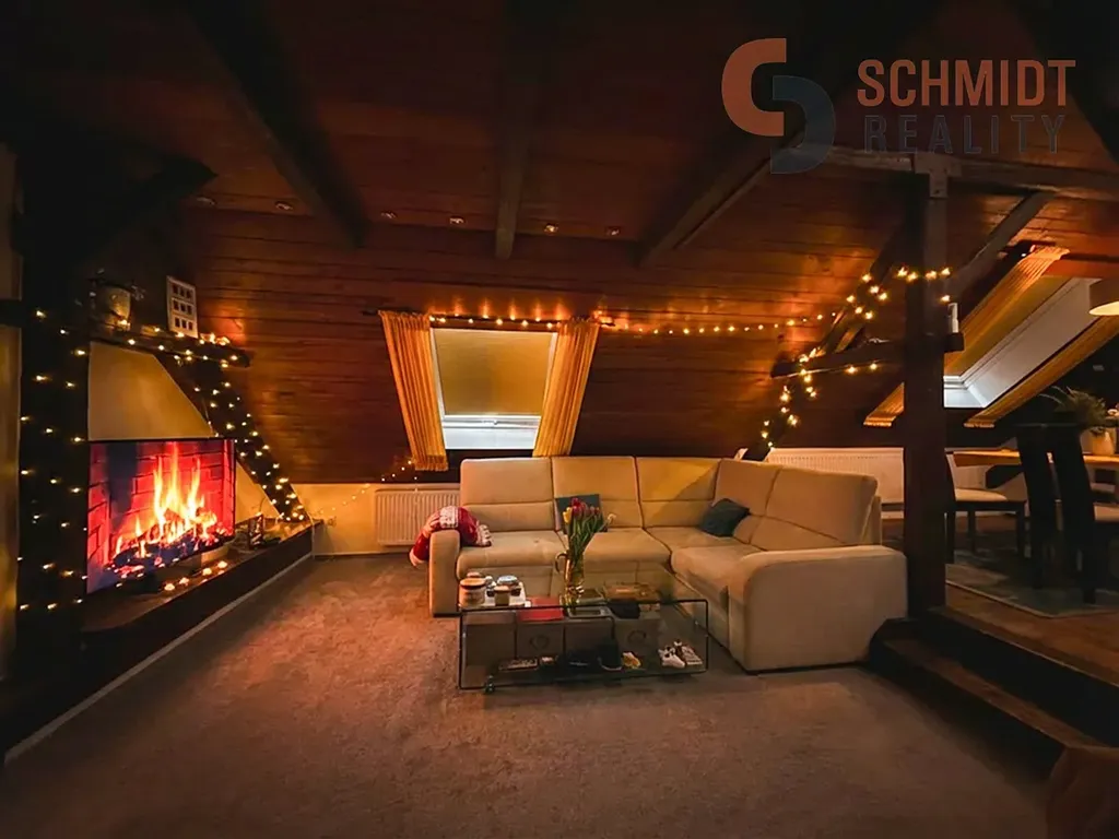 Dominantou bytu je obrovský obývací pokoj propojený s jídelnou, kde se přirozeně odehrává každodenní život. Vzdušný podkrovní prostor, dostatek světla a velkorysé rozměry vytvářejí místo, kde si užijete klidné večery i setkání s přáteli. Kuchyně je plně vybavená a prakticky řešená, doplněná o prostorný špajz, díky kterému budete mít vždy dostatek úložného místa a perfektní přehled.