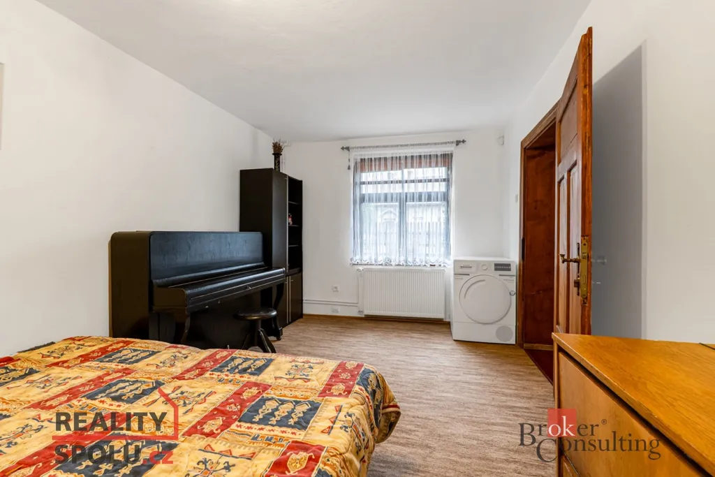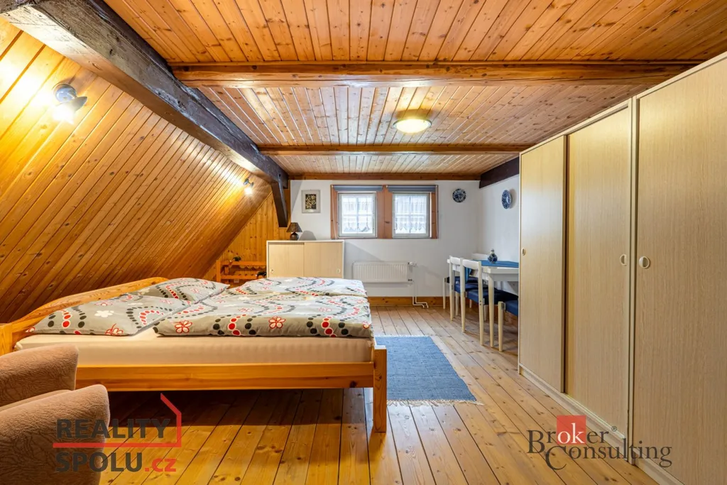 Velkou výhodou je parkování v garáži přímo u domu, nebo na pozemku, dále dílna vhodná pro kutily či podnikání, sklep pro skladování a také prostorná půda s možností dalšího využití (např. půdní vestavba, ateliér nebo další obytné místnosti).
