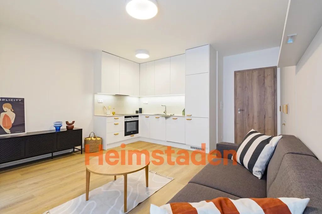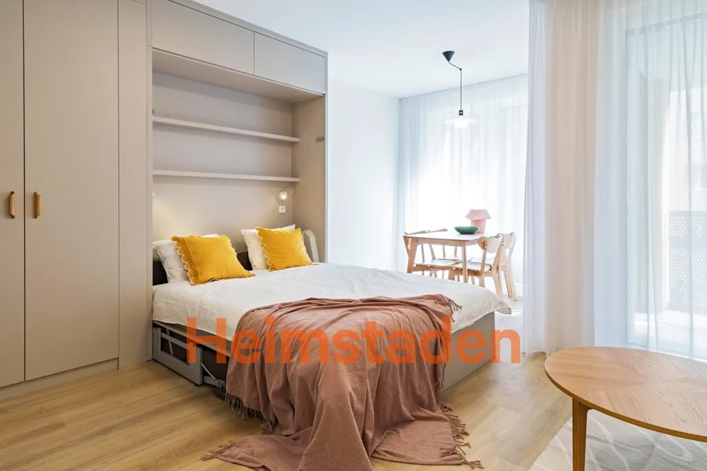 Byt disponuje obytným pokojem s dostatkem přirozeného světla a vstupem na balkon, moderní kuchyňskou linkou s vestavěnými spotřebiči včetně myčky, indukční desky, trouby a lednice s mrazákem, koupelnou se sprchovým koutem a WC a praktickým úložným prostorem. K dispozici je také pračka a venkovní rolety zajišťující komfort i soukromí. Dům je vybaven výtahem a nabízí klidný zelený vnitroblok. K bytu je možné si pronajmout garážové stání v domě, což představuje výrazný benefit v této vyhledávané části města.