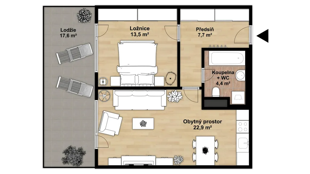 • Terasa: 17,6 m² (přístup z obývacího pokoje i z ložnice),