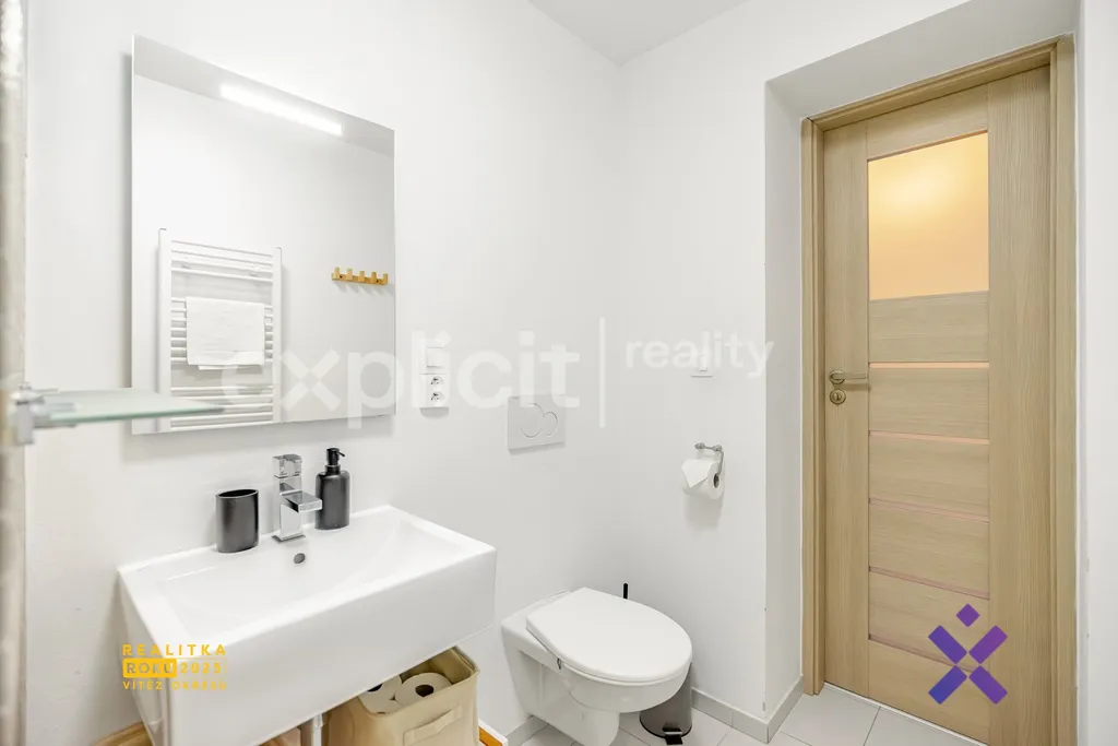 Po vstupu do apartmánu se ocitnete v chodbě s praktickou vestavěnou skříní, která poskytuje dostatek úložného prostoru. Po pravé straně se nachází koupelna spojená s toaletou, vybavená sprchovým koutem a topným žebříkem, vše v moderním a čistém provedení.