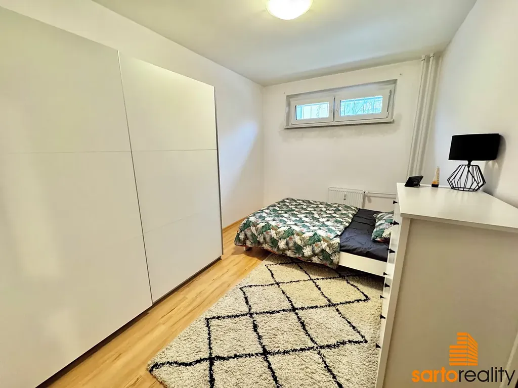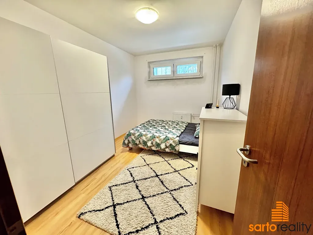 Tento byt, o velikosti 61,3 m2, je situovaný do 1.NP panelového domu. Skládá se z prostorné vstupní předsíně, obývacího pokoje s lodžií, kuchyně s rohovou kuchyňskou linkou, ložnice a velké koupelny s rohovou vanou a WC. Byt prošel v minulosti rekonstrukcí - nová koupelna vč. rohové vany, závěsného WC a bidetu, laminátové plovoucí podlahy v celém bytě, kuchyně vč. vestavěné myčky Bosch a horkovzdušné trouby Mora, interiérové dveře aj.