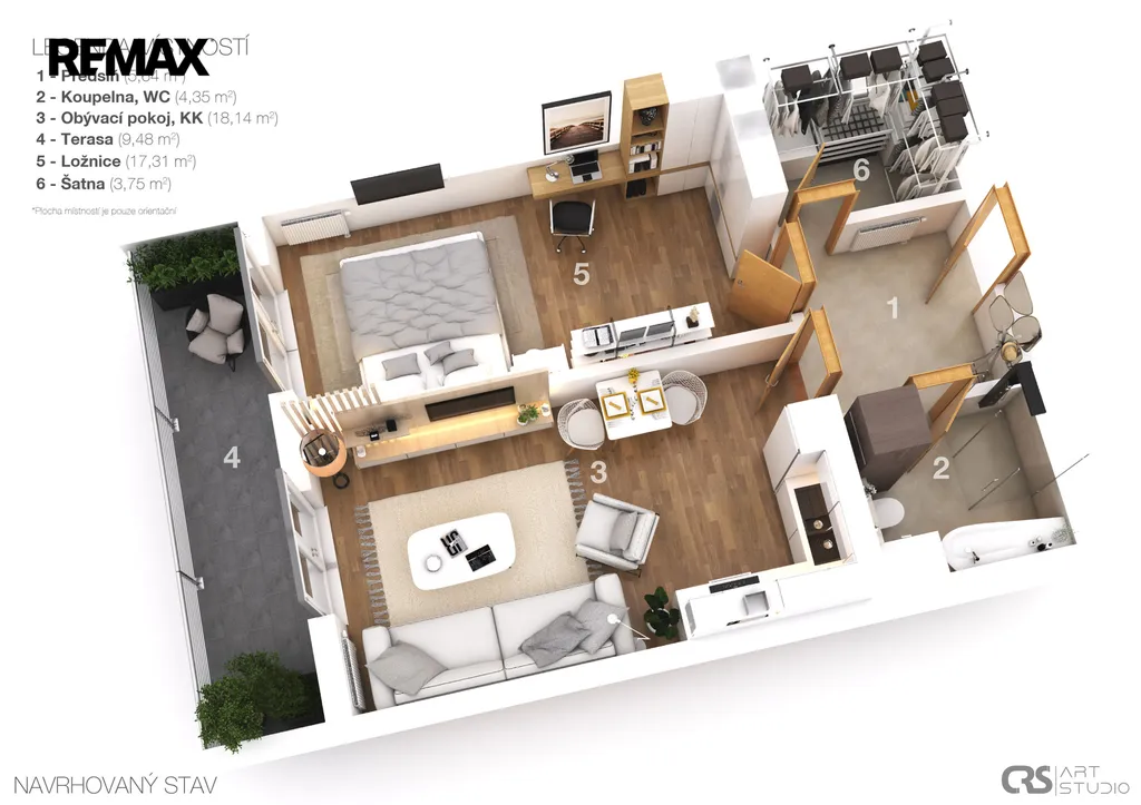 Kdyby jste se rozhodli pro rekonstrukci bytu, můžete se inspirovat vizualizacemi obývacího pokoje, ložnice a koupelny.