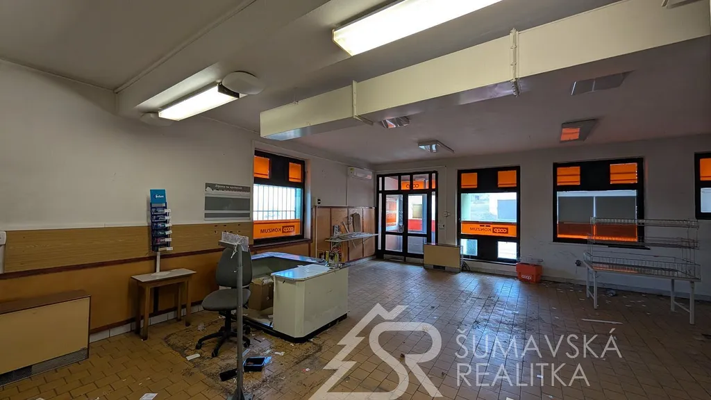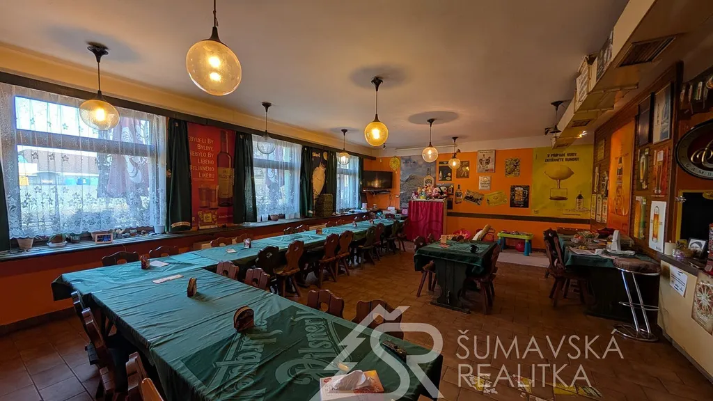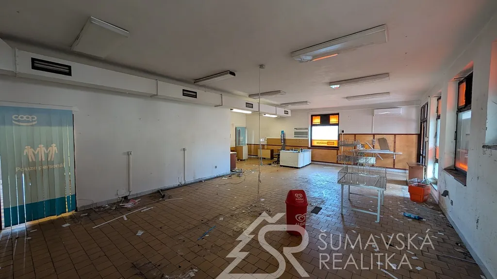 Popis nemovitosti: Jedná se o stavbu provedenou zděnou technologií, není podsklepená a má jedno nadzemní podlaží. Dům má sedlovou i pultovou střechu s betonovou krytinou. V přízemí je prodejna potravin o celkové podlahové ploše 250 m² se sklady, mrazákem, kanceláří a sociálním zařízením pro prodavače. Restaurace s výčepem, sousedním malým sálem, kuchyní, sklady, WC ženy a muži, kancelář vedoucího - vše o celkové podlahové ploše 244 m². Podlahová plocha obou budov je 494 m². Svislá nosná konstrukce je zděná o šířce 48 cm, stropy rovné, krov vazníkový sedlový, krytina tradiční betonová, okna dřevěná zdvojená, ocelové výkladce, dveře hladké a kovové. Obě budovy byly postaveny v roce 1990 a jejich údržba je na dobré úrovni.