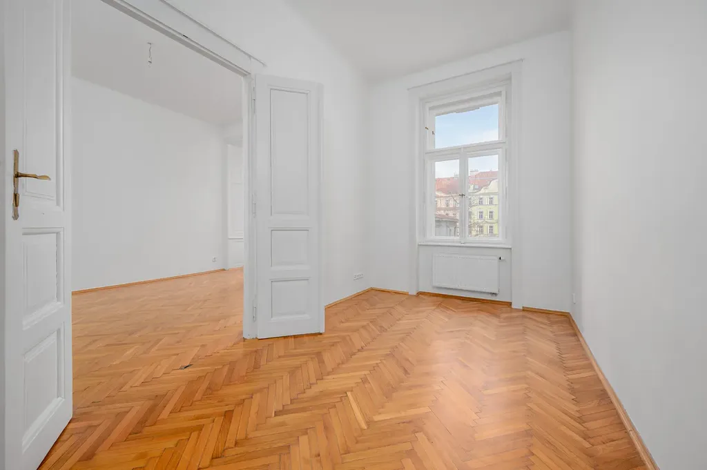 Byt s klasickými vysokými stropy a krásným výhledem nacházející se ve 2. patře prošel před nedávnem základní rekonstrukcí, je vymalovaný, všechna okna jsou repasovaná, na podlahách jsou parkety ve velmi zachovalém stavu, do obývacího pokoje i do ložnice vedou dřevěné křídlové dveře.