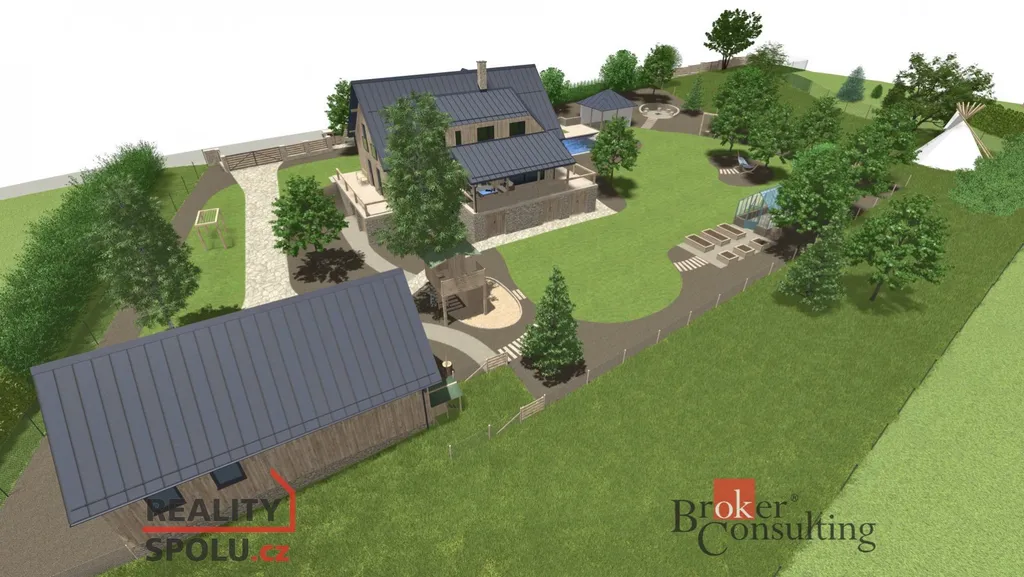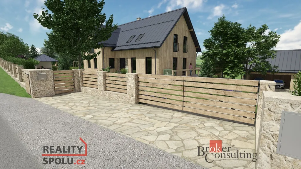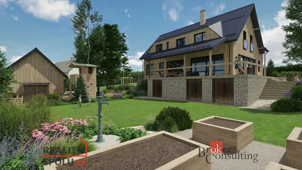 Na prezentaci je použita vizualizace rodinného domu, který není součástí prodeje, ale je na něj již vytvořena projektová dokumentace včetně architektonického zpracování vizualizace zahrady, což je velkou výhodou, čili je zde možno pokračovat v cestě ke stavebnímu povolení, což by Vám ušetřilo mnoho času.