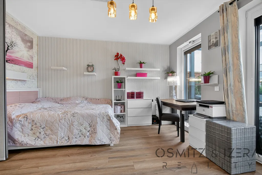 Byt v moderním designu lze snadno upravit na 2kk. Aktuálně jej tvoří prostorný obývací pokoj s kuchyní, ložnice oddělená japonskými stěnami a menší pracovna.