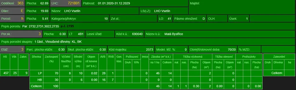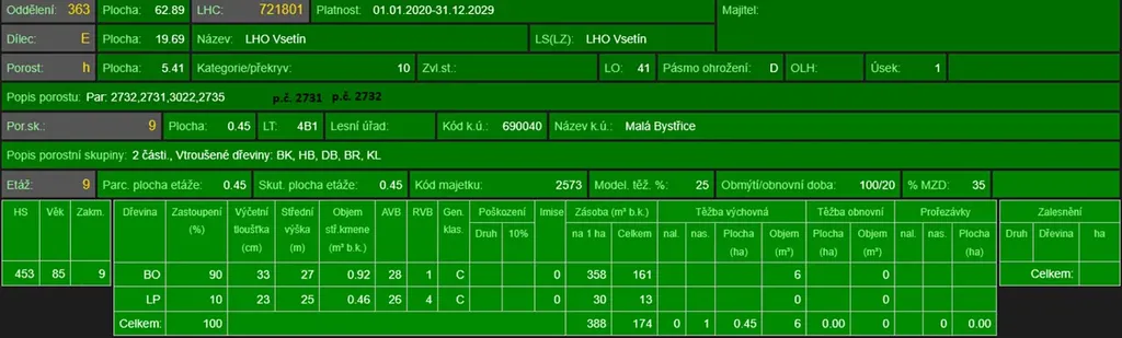 - p.č. 2735 vedená jako lesní pozemek o celkové výměře 42 830 m2 (stáří lesa 82 let - zastoupení dřevin lípa, smrk, borovice, habr, javor, stáří lesa 31 let - zastoupení dřevin lípa, habr, stáří lesa 14 let - zastoupení dřevin bříza, borovice, stáří lesa 9 let - zastoupení dřevin buk, smrk),