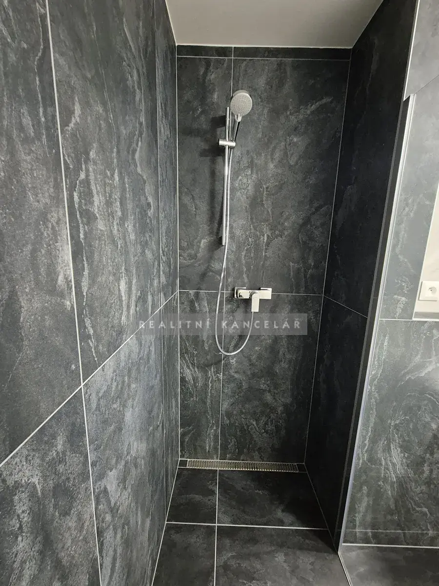 Koupelna – sprchový kout, páková sprchová baterie, umyvadlo s pákovou baterií umyvadlovou, zrcadlo s osvětlením, přípojka na pračku.
