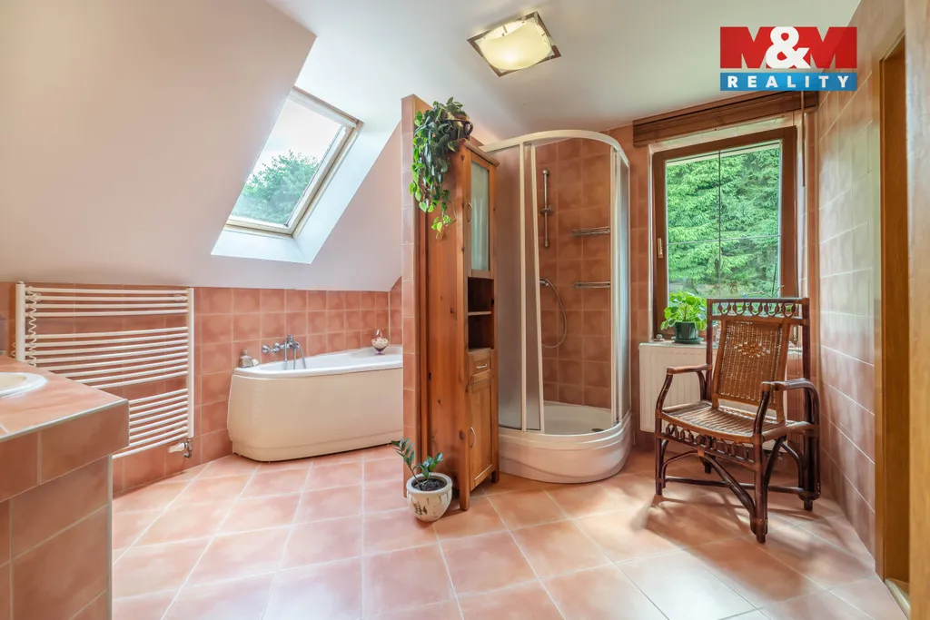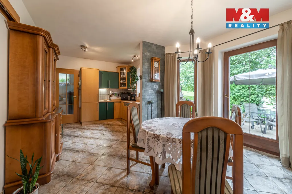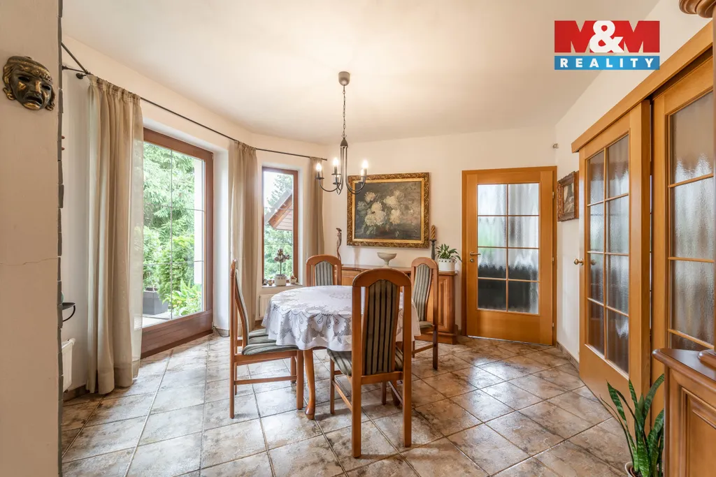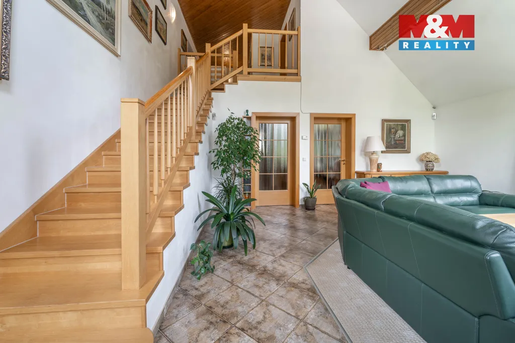 Solidní rodinný dům z r. 2005 o dispozici 4+1. Kromě bydlení nabídne i 2 zařízené apartmány na pronájem s odděleným vstupem, s vlastními sociálními zařízeními a kuchyní. Dům se rozkládá ve 2 NP a 1 PP s technickým zázemím - dílna, kolárna, sklad, garáž, kotelna s prádelnou, šatna. Srdcem domu je obývací pokoj s balkonem (28,1 m²) ve vysokém otevřeném prostoru, procházející přes 2 podlaží, který zaujme především velkými atypickými okny. Na obývací pokoj navazuje vkusně zařízená kuchyně s jídelnou se vstupem na terasu. Dále v obytné části najdeme pracovnu se žehlírnou, 2 ložnice, přičemž hlavní ložnice disponuje šatnou průchozí do prostorné koupelny s vanou a sprchovým koutem. Stavba je vybavena pokročilými technologiemi pro úsporu energií. Vytápění je zajištěno tepelným čerpadlem s možností dotápění kondenzačním plynovým kotlem, na střeše jsou osazeny FTV solární panely. V celém domě je rozveden centrální vysavač. Na zahradě se nachází bazén s vl. tepelným čerpadlem a pískovou filtrací.
