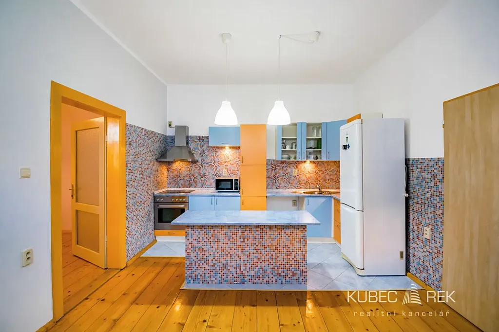 Kuchyně je vybavena kuchyňskou linkou, elektrickou troubou se sklokeramickou varnou deskou, lednicí a digestoří. Na podlahách jsou dřevěné palubky, které interiéru dodávají teplý a útulný charakter, zatímco v koupelně najdete dlažbu s podlahovým vytápěním.