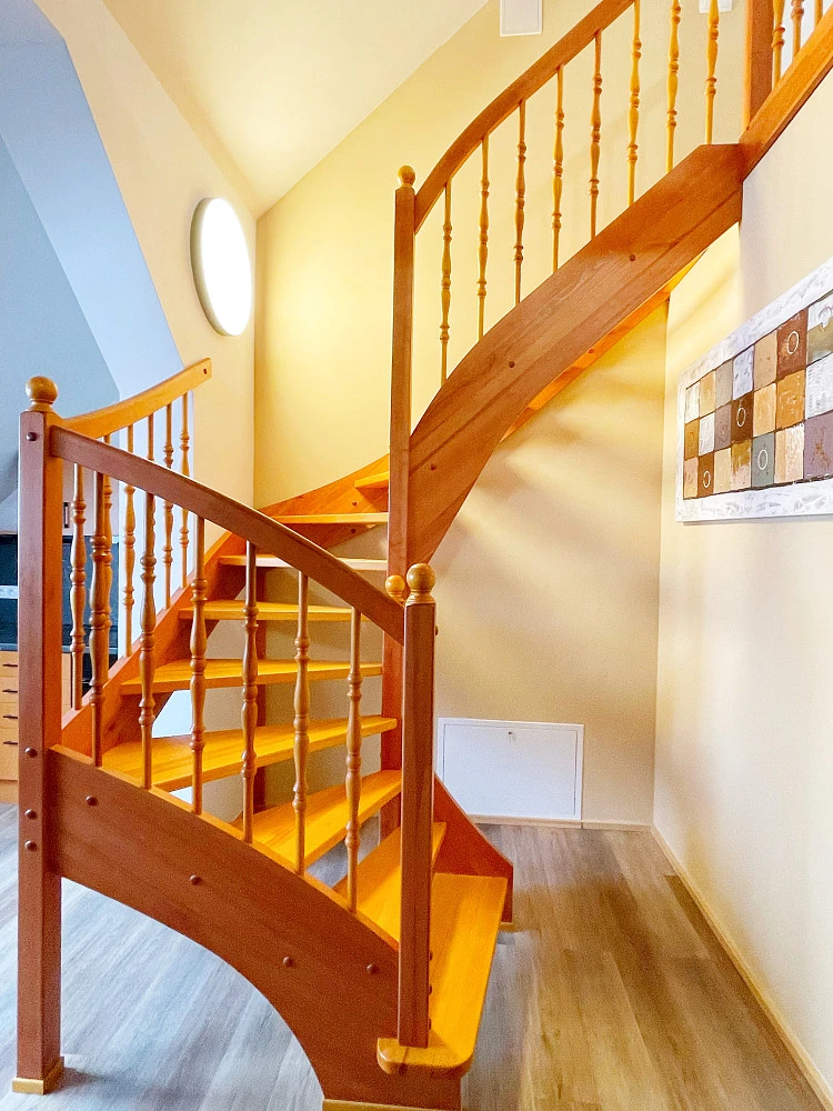 Po novém dřevěném schodišti (jasan) vyjdete do 2. bytu, který byly rovněž kompletně zrekonstruován, avšak dosud neužíván. Zde naleznete kompletně zařízený kuchyňský kout, pokoj, WC, koupelna je připravena k osazení, resp. dokončení dle Vašeho výběru.