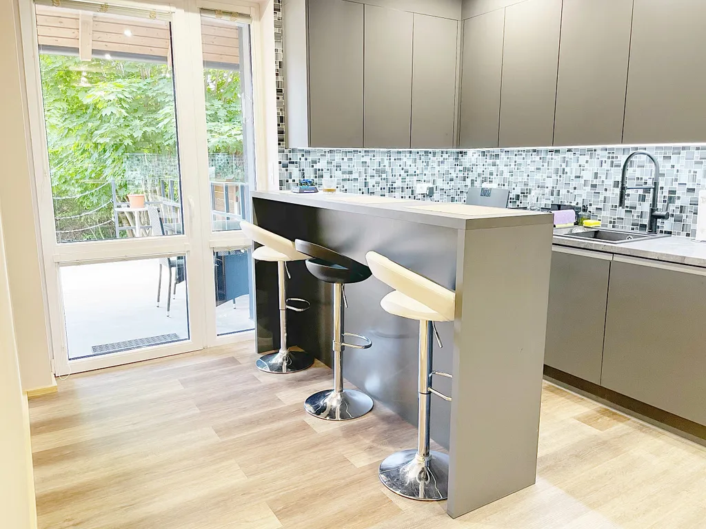 V prvním nadzemním podlaží na Vás čeká byt s prostornou, luxusně vybavenou kuchyní s barem. Dále je k dispozici koupelna se sprchovým koutem a toaletou a dalším pokojem. Z kuchyně je možné vyjít na terasu na zahradě v zadní části domu.