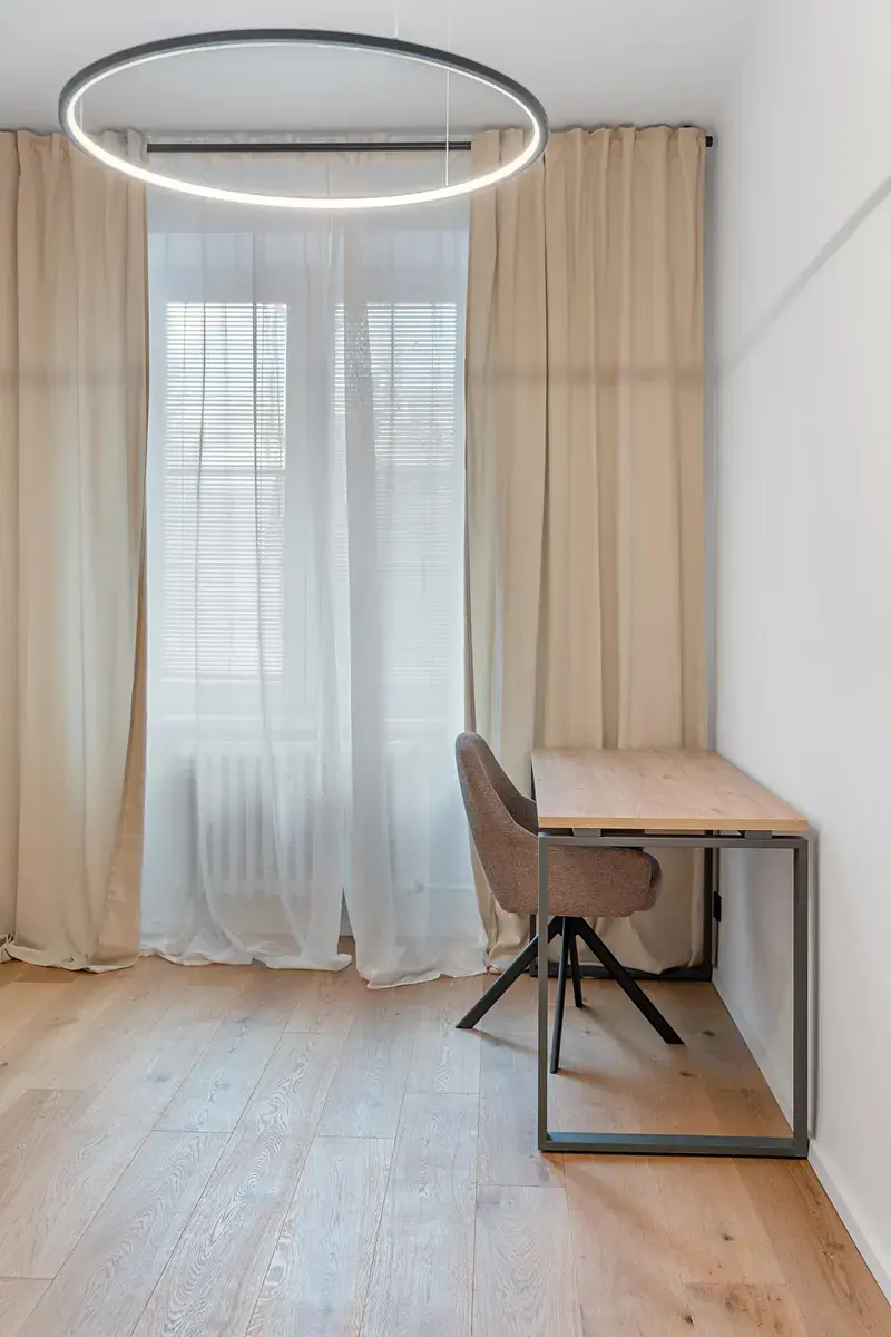 Dominantou bytu je moderní obývací prostor s kuchyňským koutem. Kuchyňská linka je vybavena spotřebiči včetně lednice s mrazákem a indukční varné desky. Interiér bytu podtrhují dřevěné podlahy, prémiové zařizovací prvky a designové osvětlení s možností dálkového ovládání.