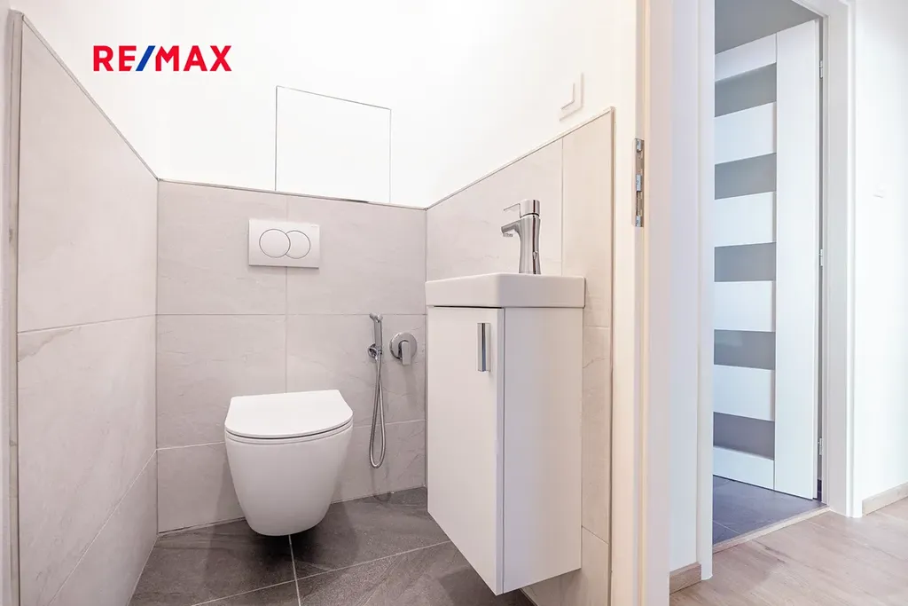 V předsíni je jak prostor na vestavnou skříň, tak walk in šatna. Koupelna má prostorný sprchový kout a toaleta je samostatná a nadstandardně prostorná.