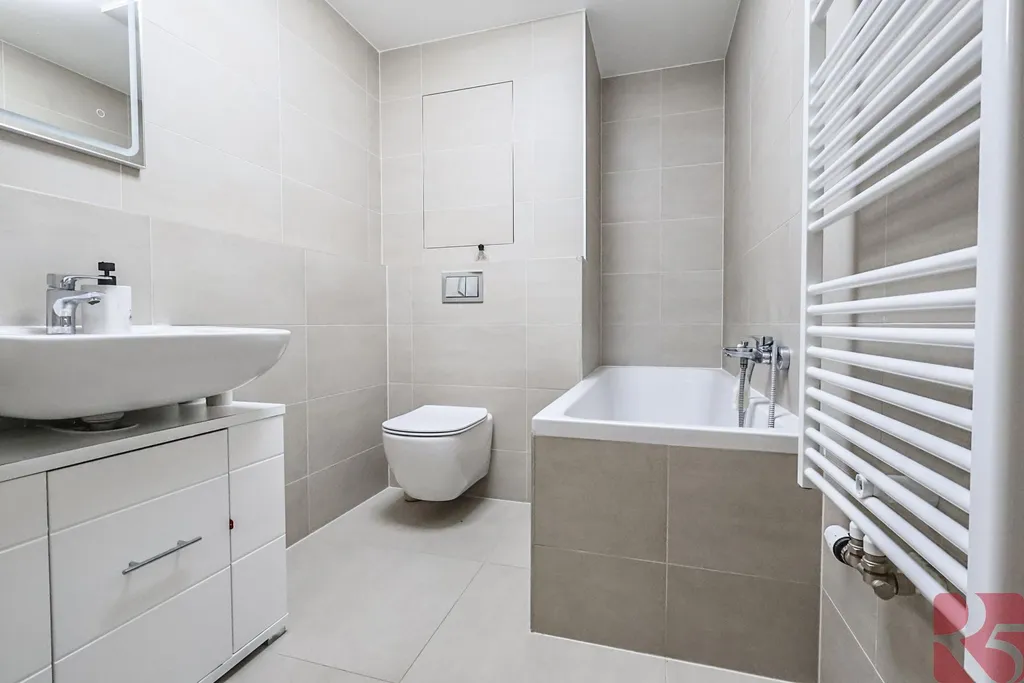 Koupelna s vanou, pod umyvadlem skříňka, zrcadlo s osvětlením podtrhuje moderní ráz bytu.