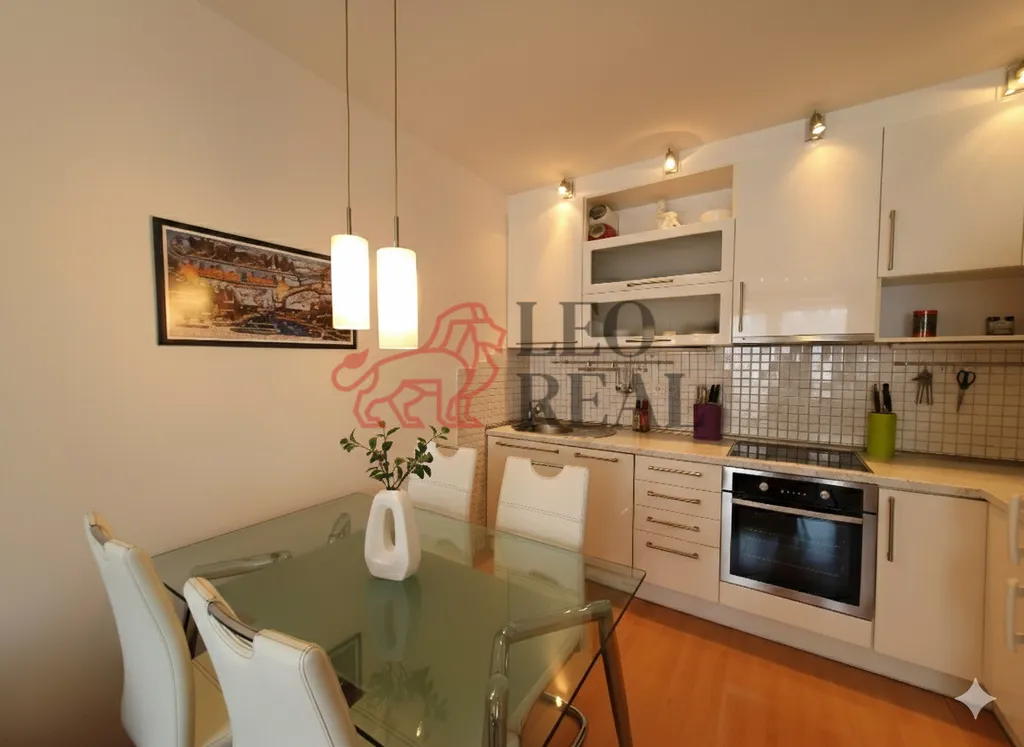 • Obývací pokoj s kuchyňským koutem: Kompletně vybavená linka s vestavěnými spotřebiči (sklokeramická deska, horkovzdušná trouba, digestoř, lednice s mrazákem, mikrovlnná trouba).