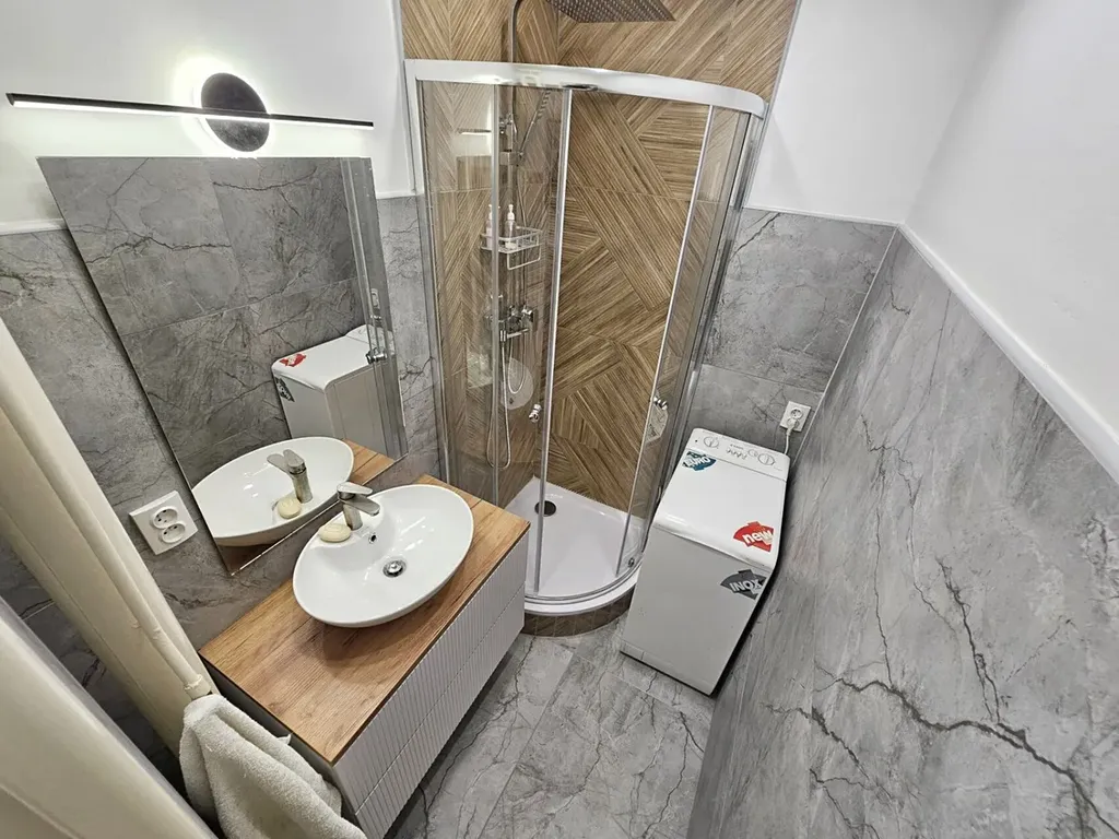 V bytě se nachází prostorný pokoj s kuchyňským koutem (linka s myčkou, sklokeramickou varnou dvouplotýnkou, digestoří, mikrovlnnou troubou a lednicí) + koupelna se sprchovým koutem (pračka) + samostatné WC + předsíň + lodžie.