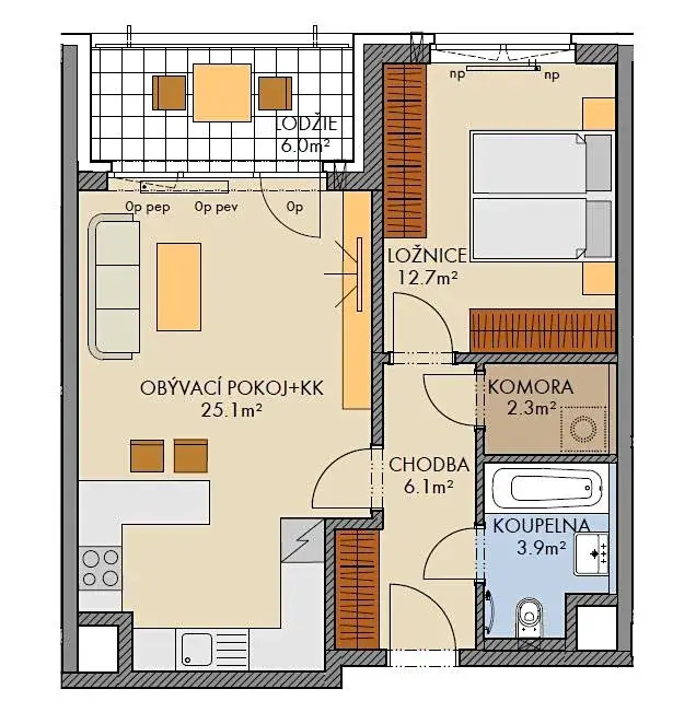 Byt 2+kk o velikosti 52,2 m2 + lodžie 6,0 m2 se nachází ve 3. nadzemním podlaží (z celkových šesti) s orientací na jihovýchod.