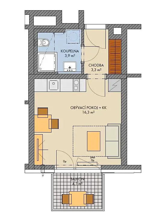 Byt 1+kk o velikosti 24,4 m2 + balkon 4,1 m2 se nachází v 6. nadzemním podlaží (z celkových sedmi) s orientací na jih.