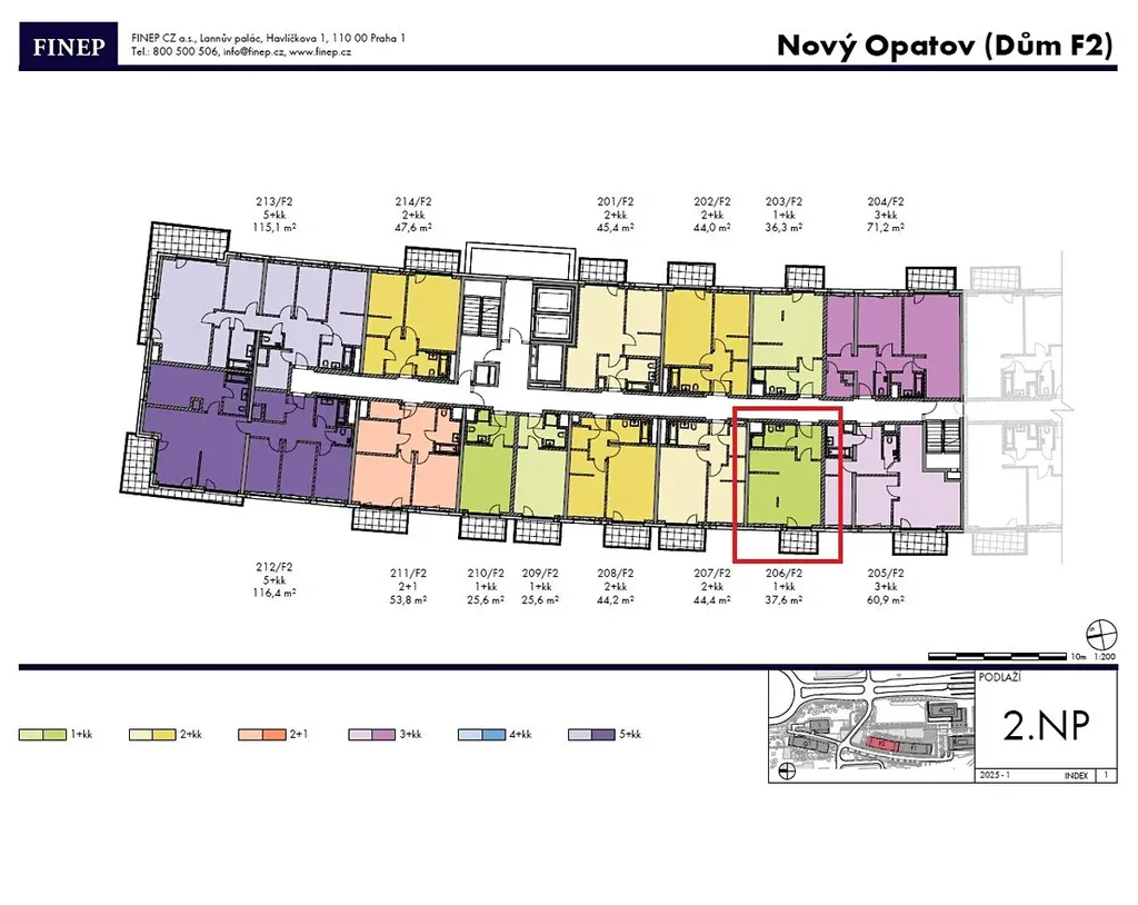 Bytová jednotka 1+kk o velikosti 37,6 m2 + balkon 4,4 m2 se nachází ve 2. nadzemním podlaží (z celkových dvanácti) s orientací na jihovýchod.