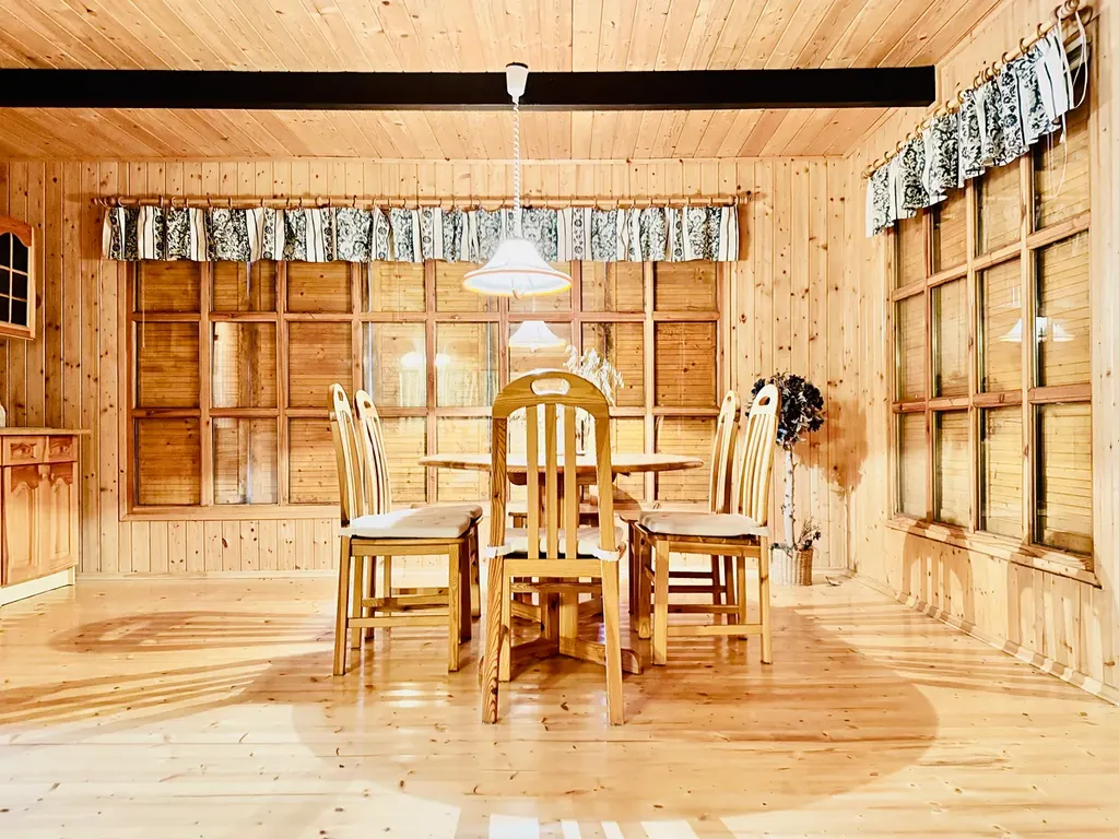 Následně vstup do hlavního obytného prostoru, zde jsou umístěna kachlová kamna k vytápění, obývací kout s velkou sedací soupravou, kterou lze využít na přespání dvou osob. Kuchyňská část je prostorná s jídelním stolem a kuchyňskou linkou, v této části je francouzské okno. Kuchyně vybavená lednicí a elektrickým sporákem s pečící troubou. Schody do podkroví.