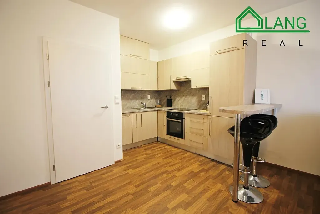 Součástí nabízené bytové jednotky je kuchyňská linka s varnou deskou, troubou, digestoří a vestavěnou lednicí. Kuchyňský kout je lehce oddělen vyvýšeným stolem s 2 barovými židlemi.
