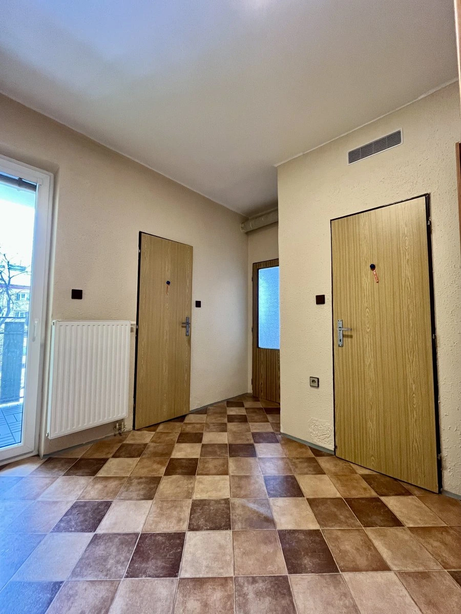 Dispozice bytu nabízí prostornou vstupní chodbu s vestavěnou šatní skříní a vstupy do jednotlivých místností – koupelny, samostatné toalety, kuchyně a na balkon. Z kuchyně se vstupuje do neprůchozího pokoje, který zajišťuje dostatek soukromí.