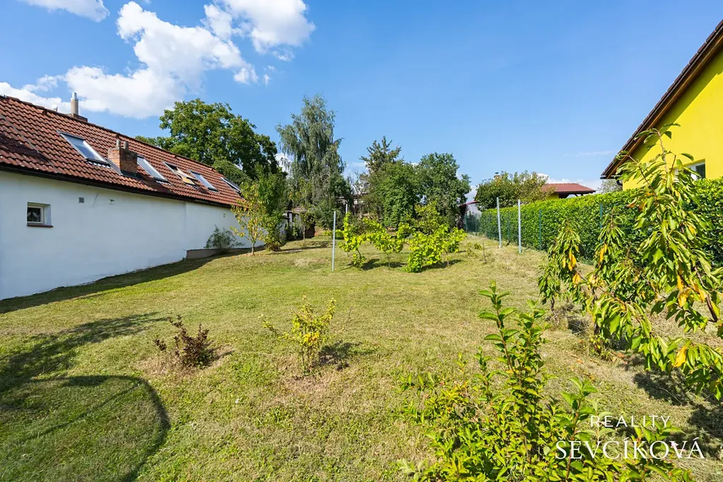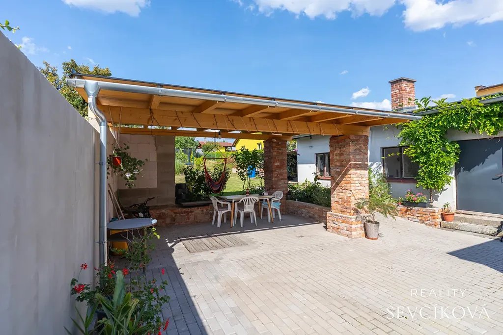 Na pozemku je dvůr a vjezd do garáže se zámkovou dlažbou, pergola a garáž propojená s dílnou, komorou a bývalou prádelnou (celková plocha 38 m²), která je částečně podsklepena a nabízí možnost vybudování letní kuchyně. Za touto stavbou se nachází prostorná zastřešená zpevněná plocha. Zahrada je mírně svažitá, pečlivě udržovaná a poskytuje maximum soukromí, a to i přes své umístění v zástavbě.