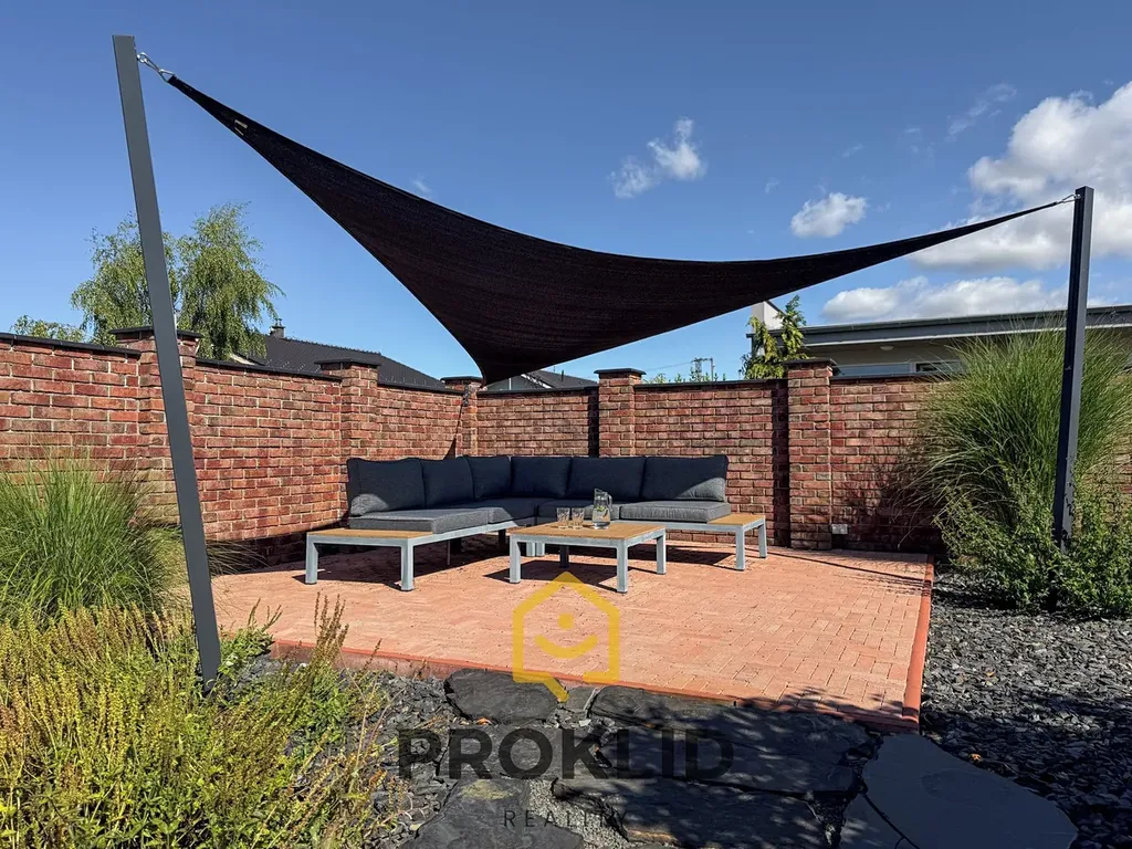 Zahrada je tvořena okrasnými prvky, živým plotem, dvěma terasami a velkým zatravněným placem s automatickou závlahou, která čerpá dešťovou vodu z akumulační nádrže. První terasa je přímo u domu pro posezení s rodinou nebo přáteli a to včetně bioklimatické hliníkové pergoly s možností naklápění střešních lamel pro nepříznivé počasí, stín nebo naopak prosvětlení prostoru. Druhá terasa je v rohu zahrady dál od domu a slouží více k odpočinku a relaxaci na slunci nebo ve stínu pod stínící plachtou.