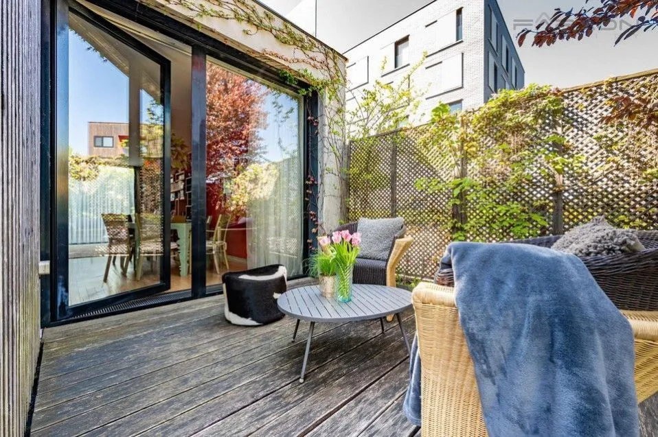 První (horní) podlaží představuje privátní obytnou část domu dvě komfortní ložnice, dvě koupelny (jedna s vanou) a prostorná terasa, která nabízí klidné zázemí s výhledem do zeleně.
