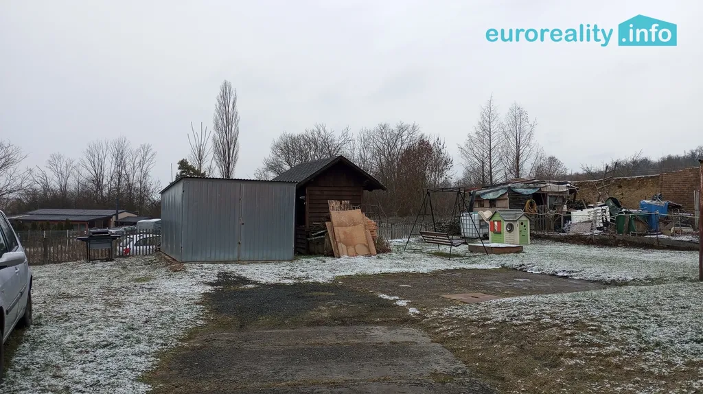 K bytu náleží zahrada s plechovou garáží a dřevěnou kůlnou.